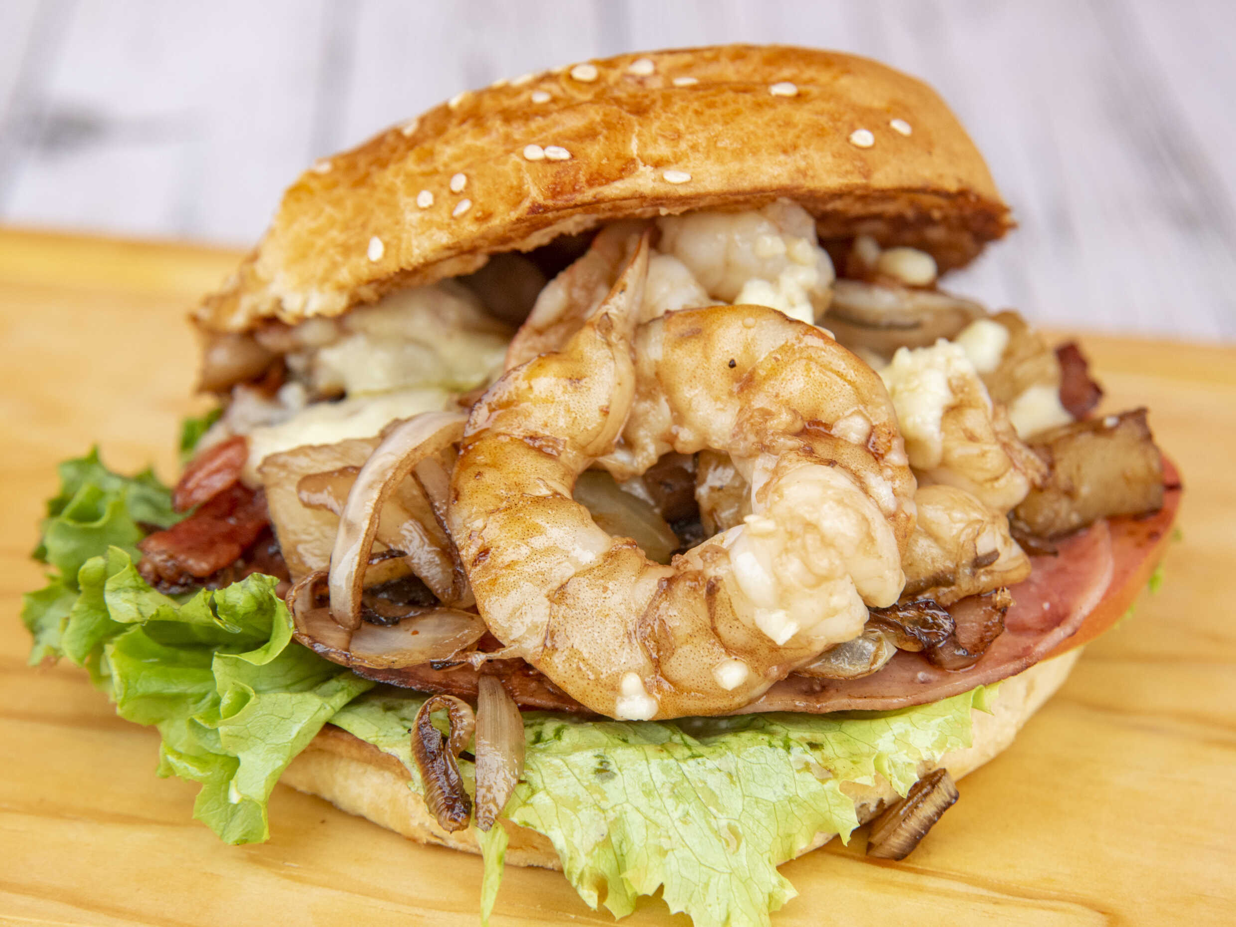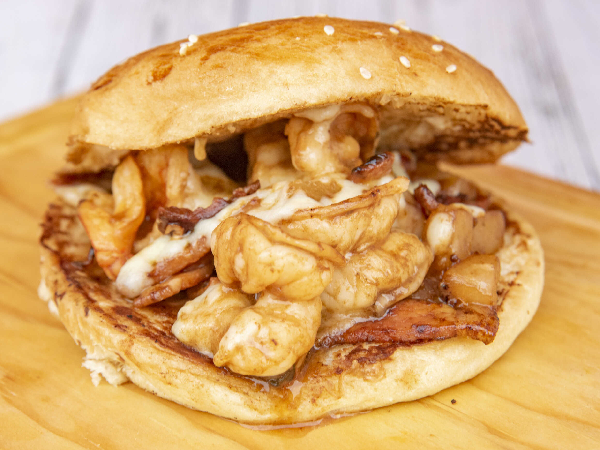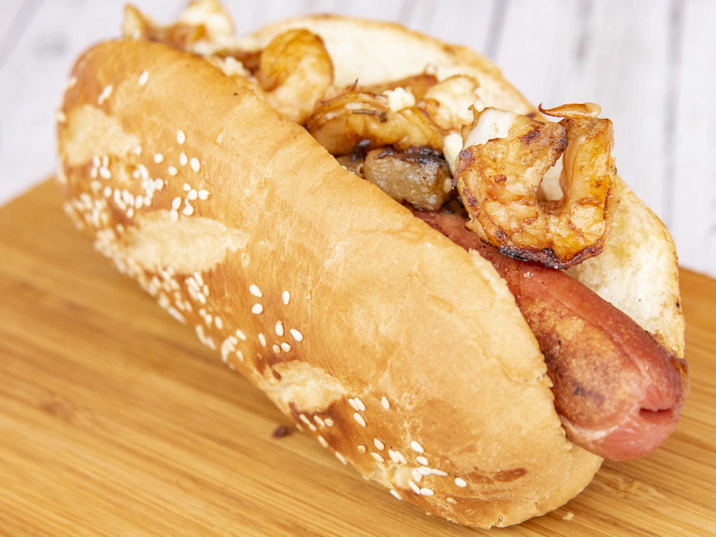 Con salchicha de pavo envuelta en tocino, camarón, piña y queso blanco.