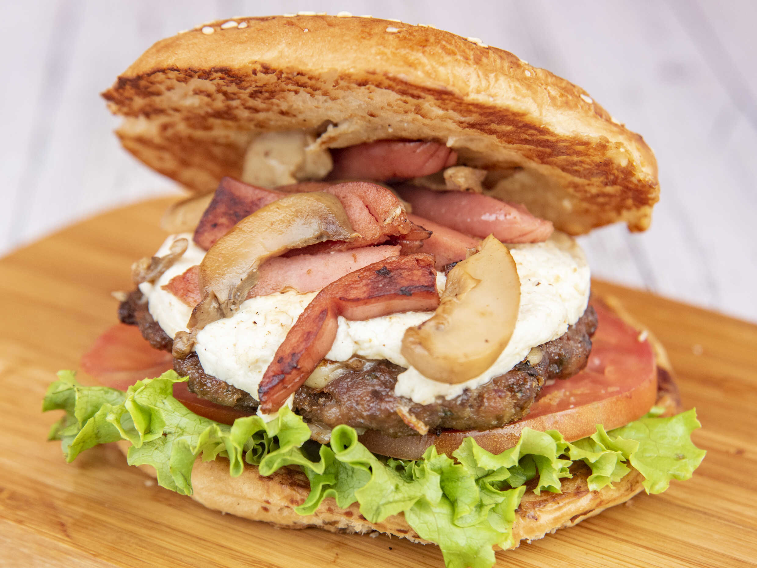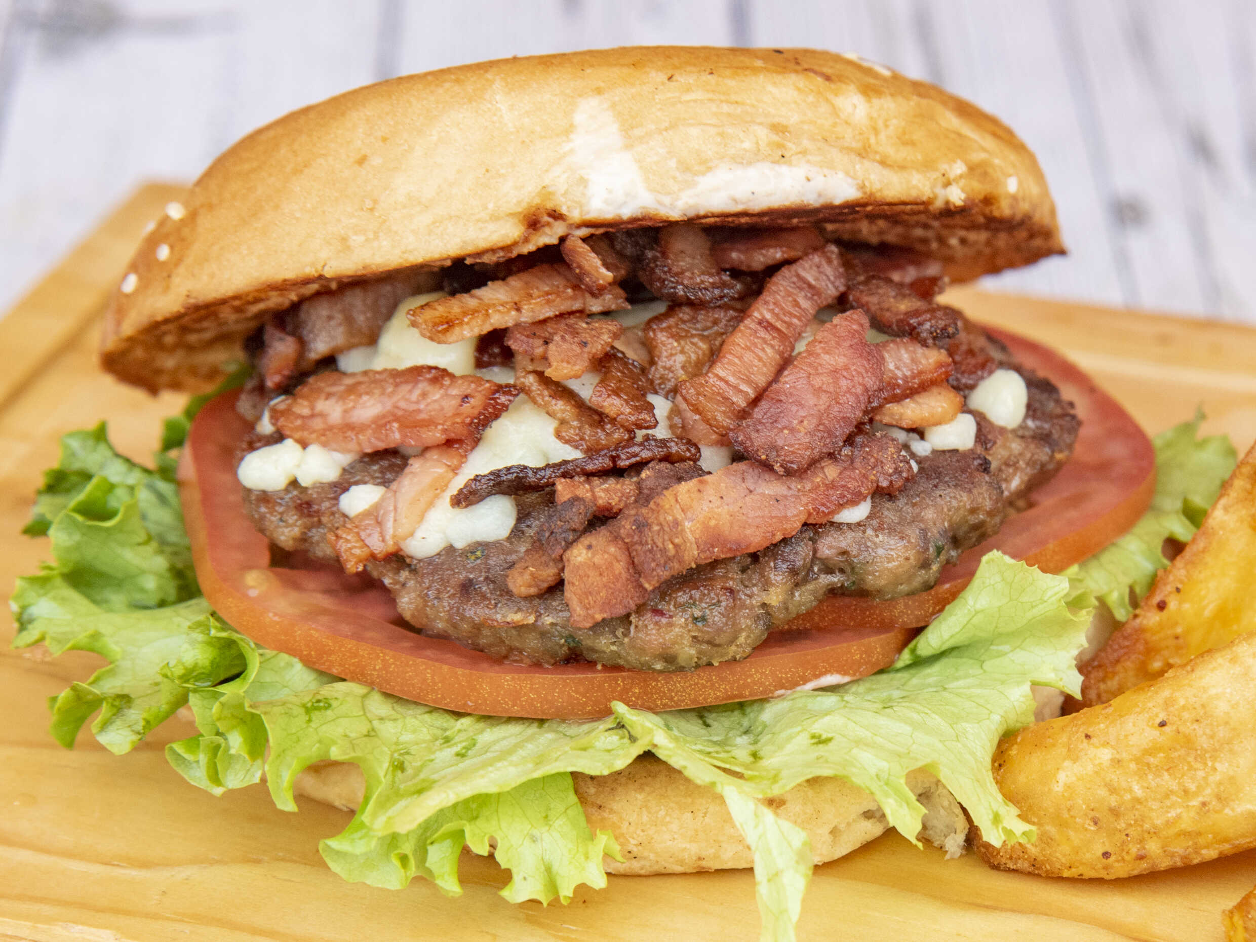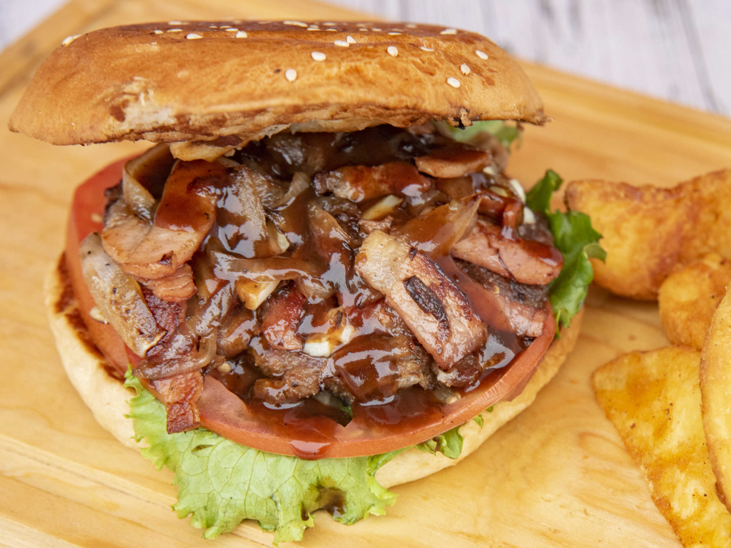 Con carne, tocino, BBQ, queso y cebolla guisada.