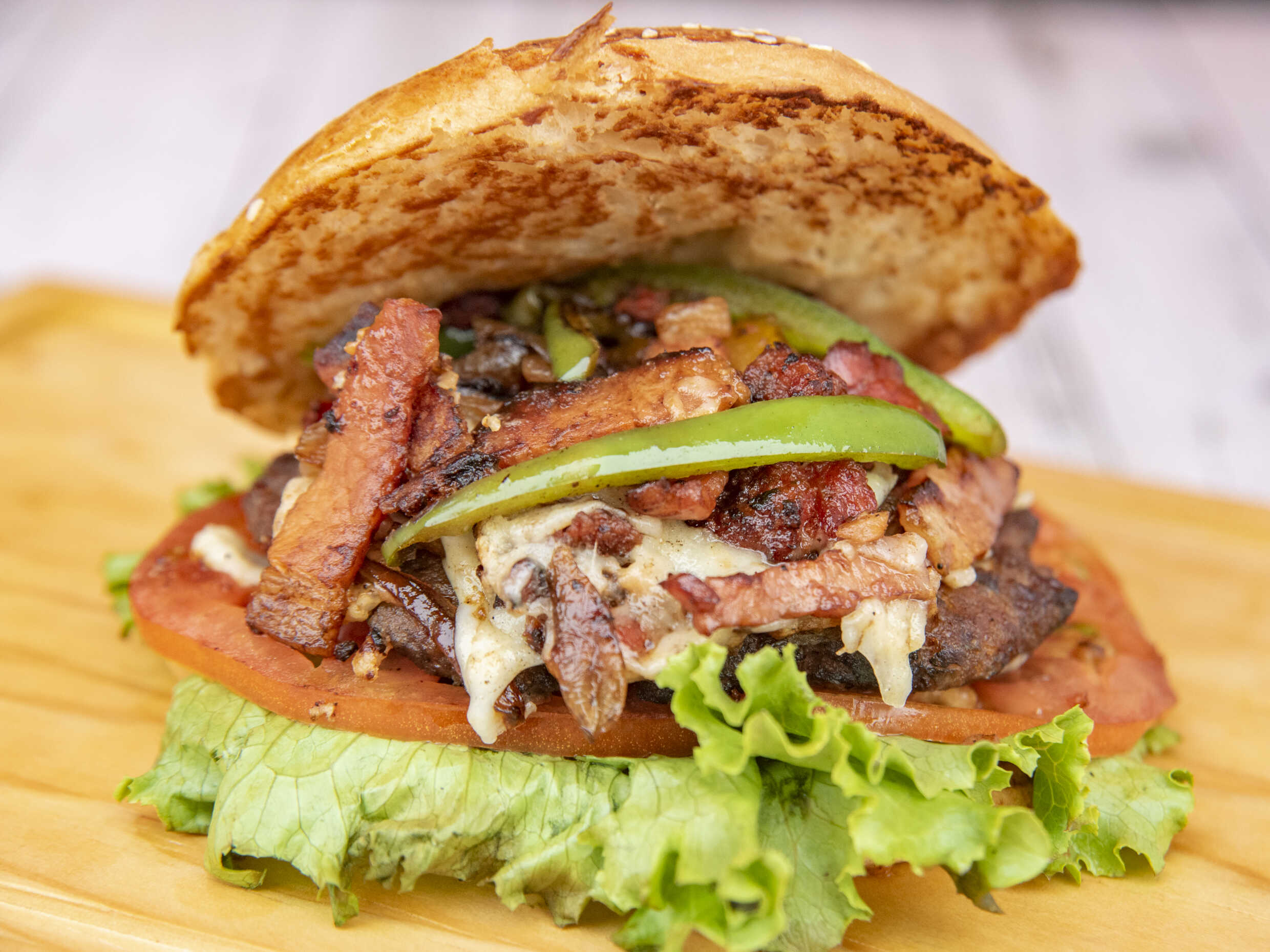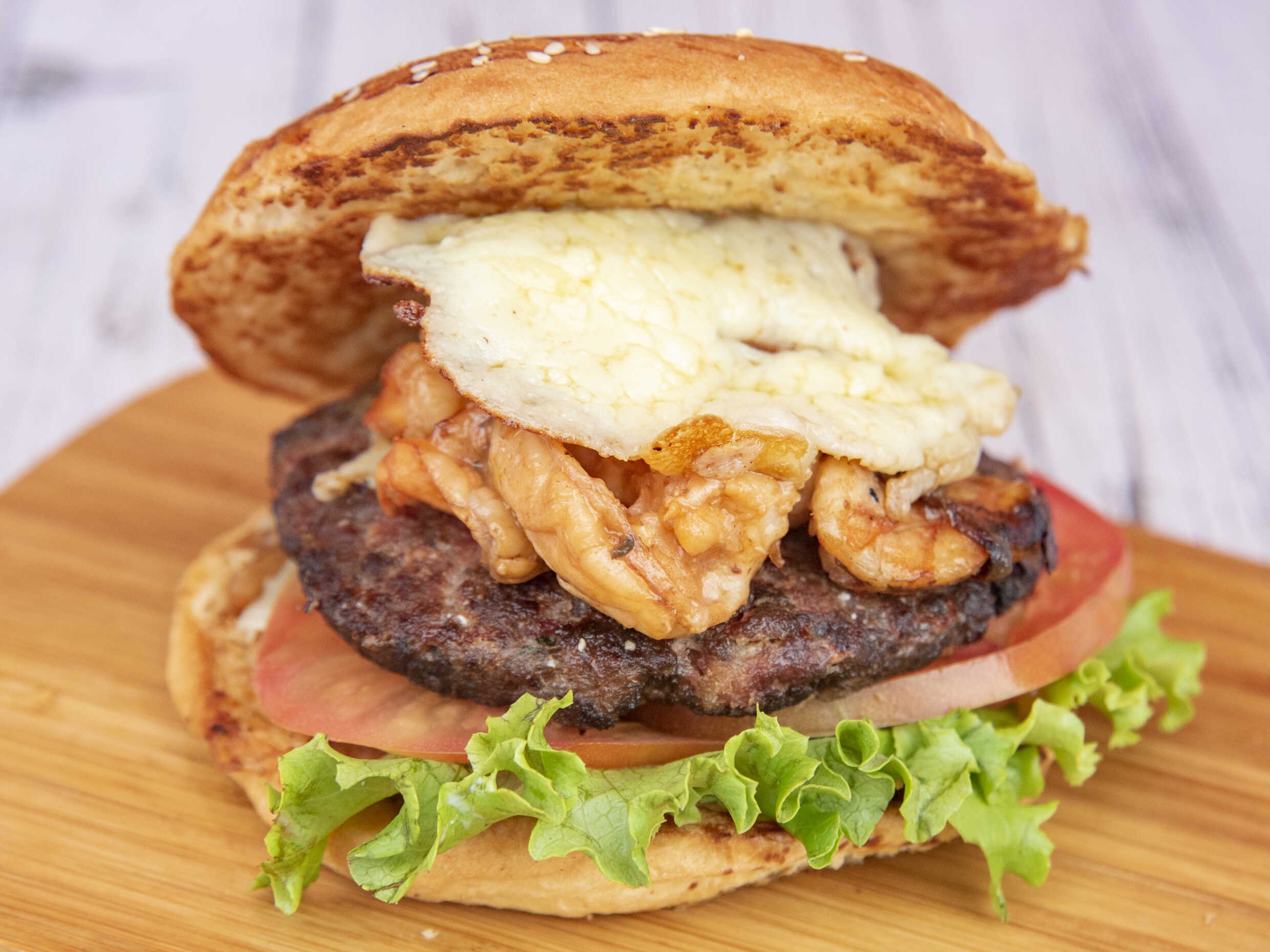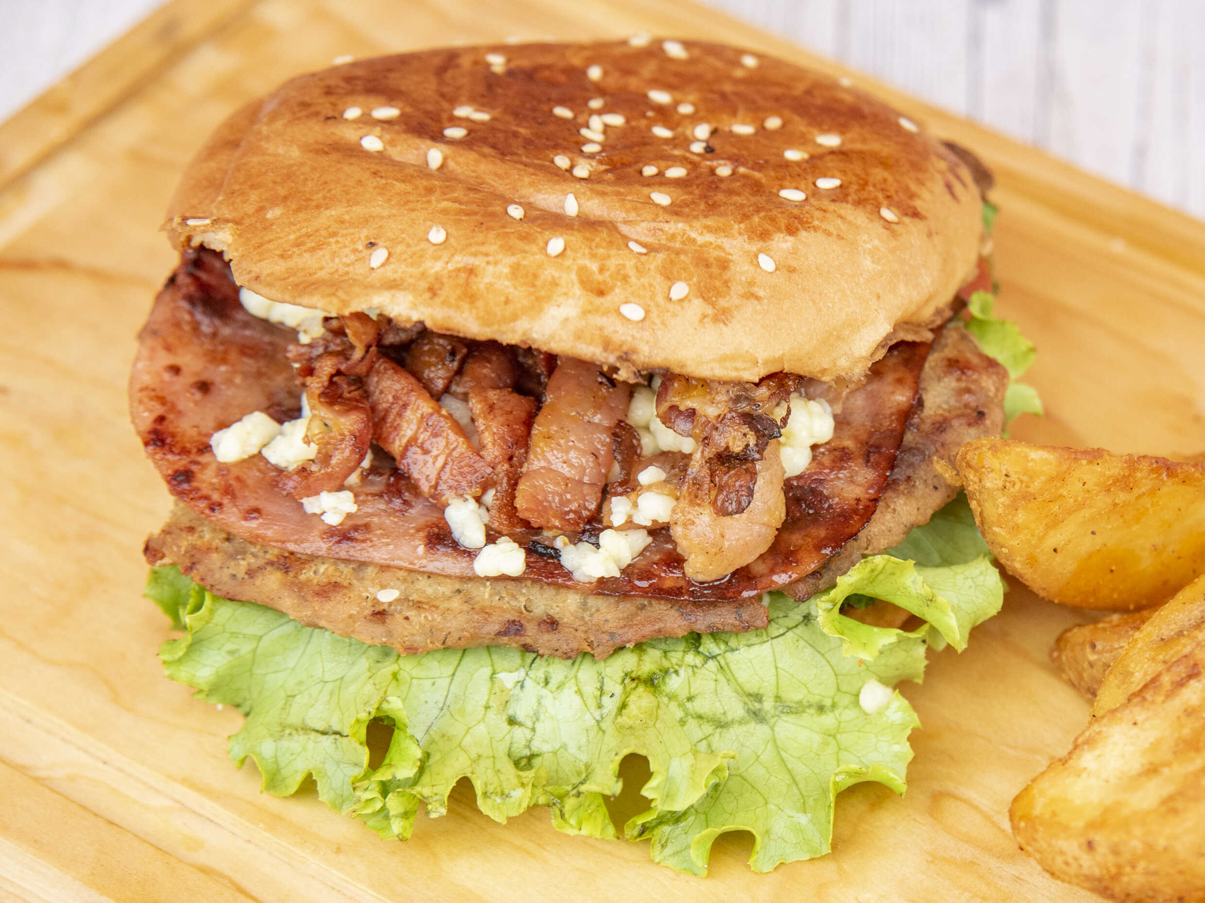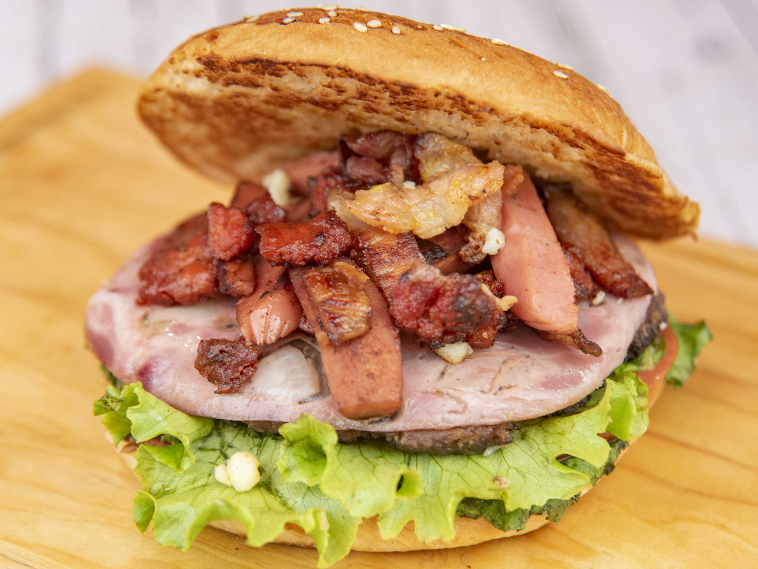 Con carne, tocino, BBQ, queso y cebolla guisada.