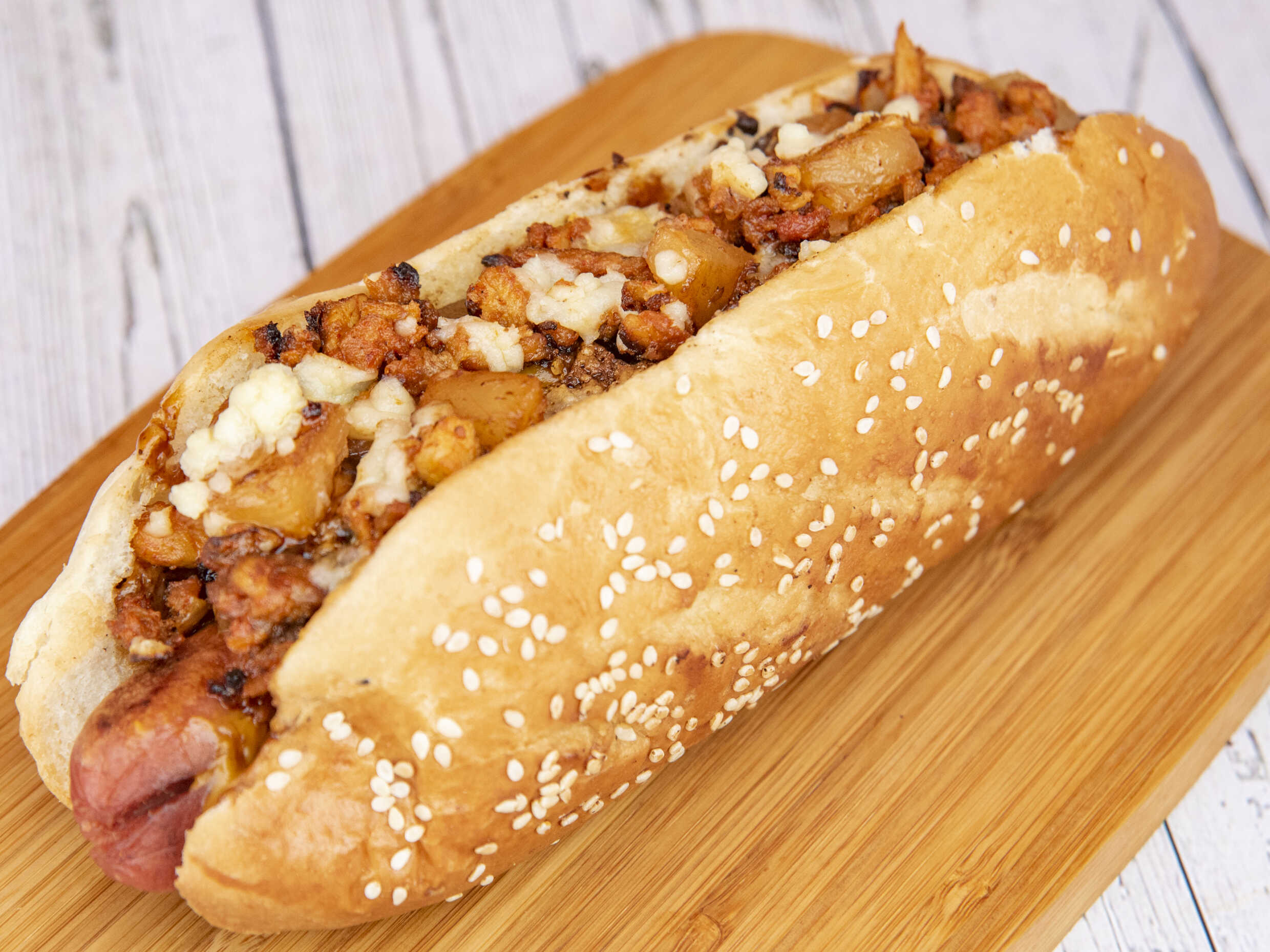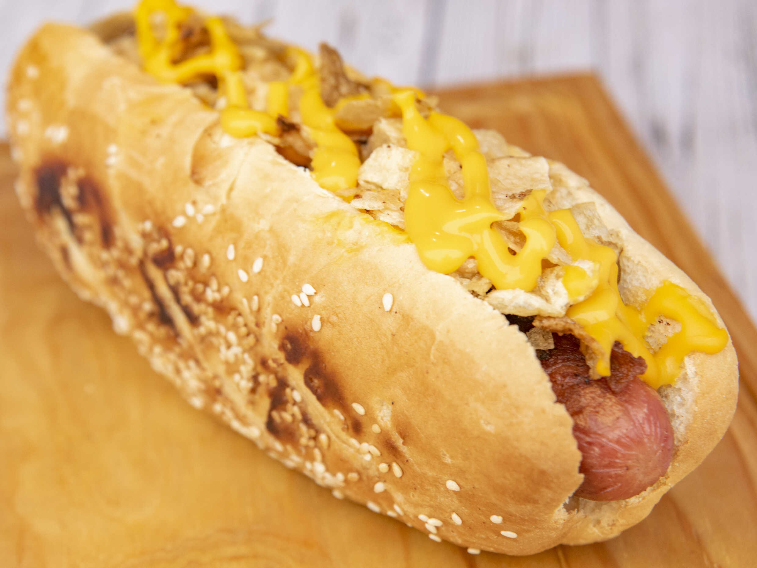 Con salchicha de pavo envuelta en tocino, con cebolla guisada, queso amarillo y crujientes trozos de papa.