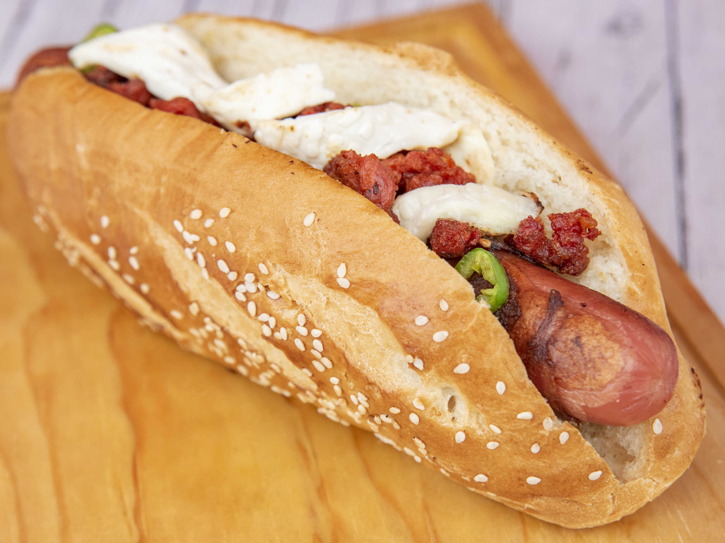 Con salchicha de pavo envuelta en tocino, chorizo, panela y chile serrano.