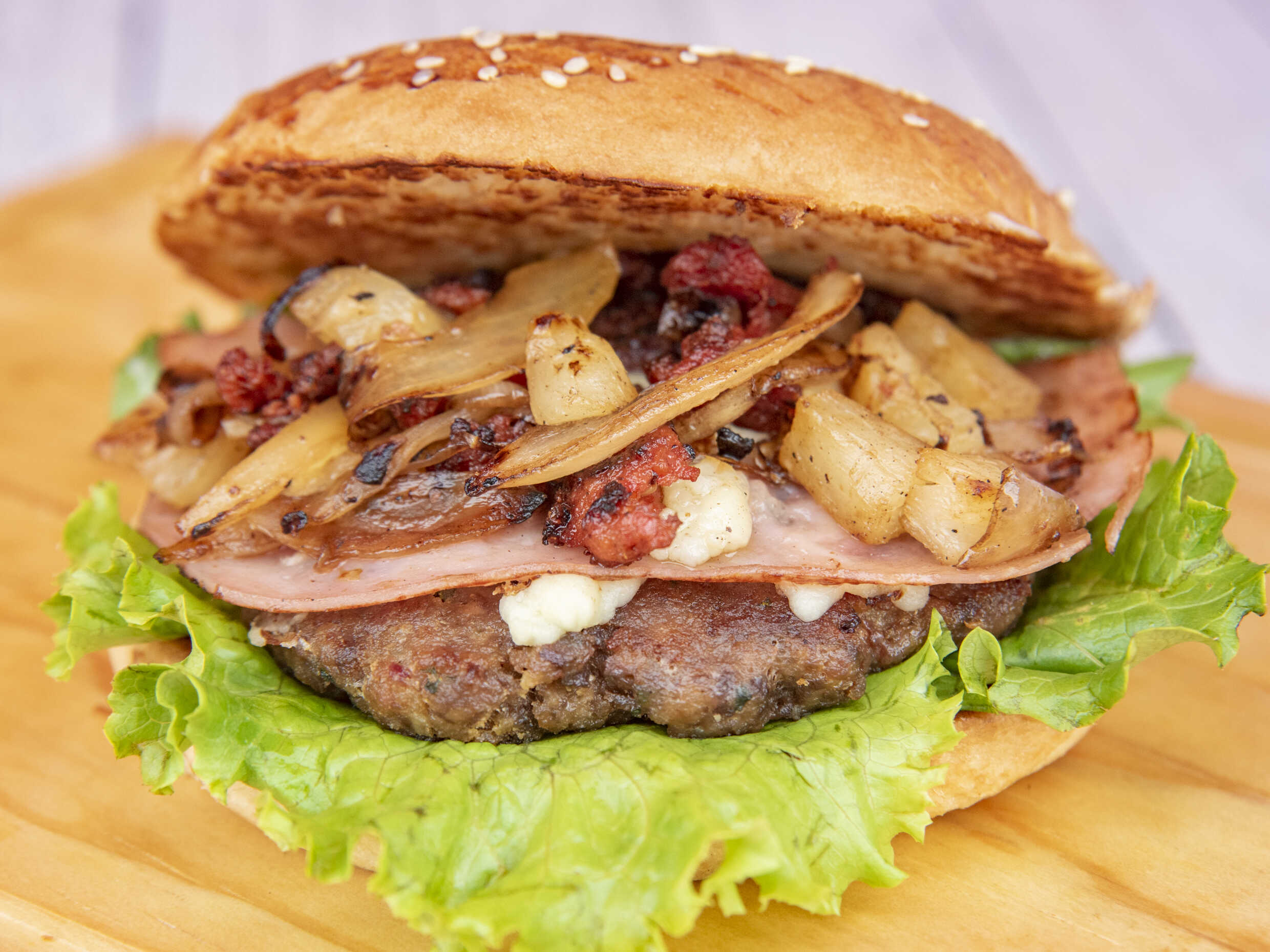 Con carne, chorizo, morrón, tocino, queso y cebolla guisada.
