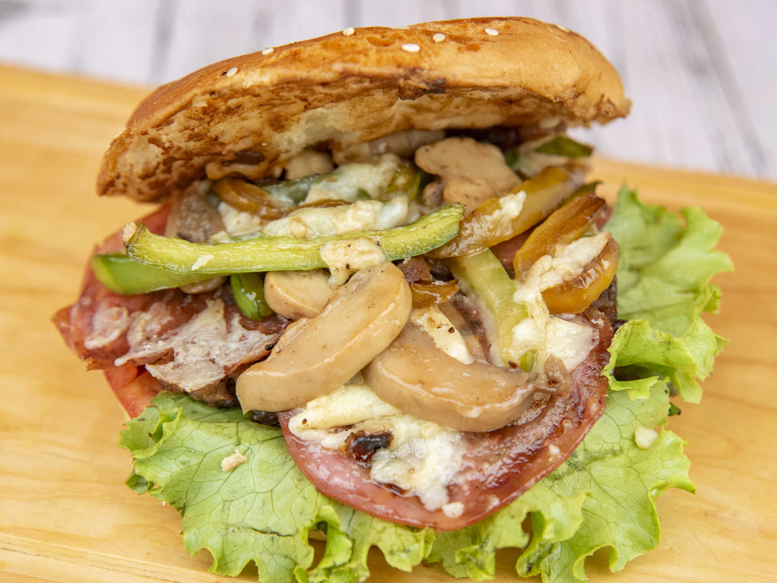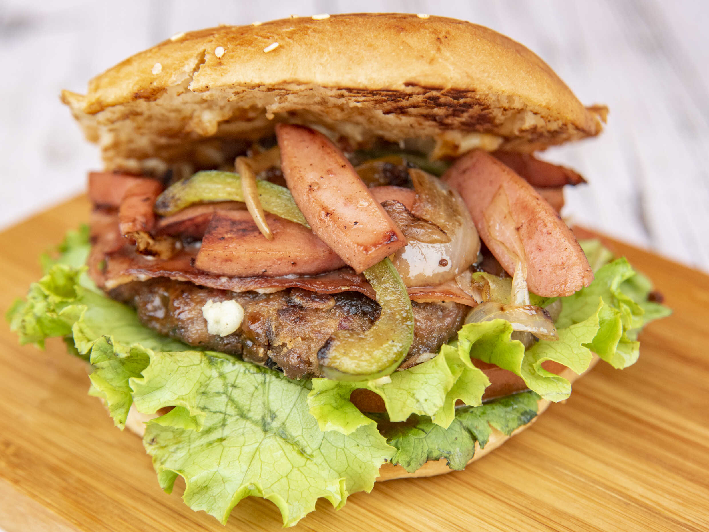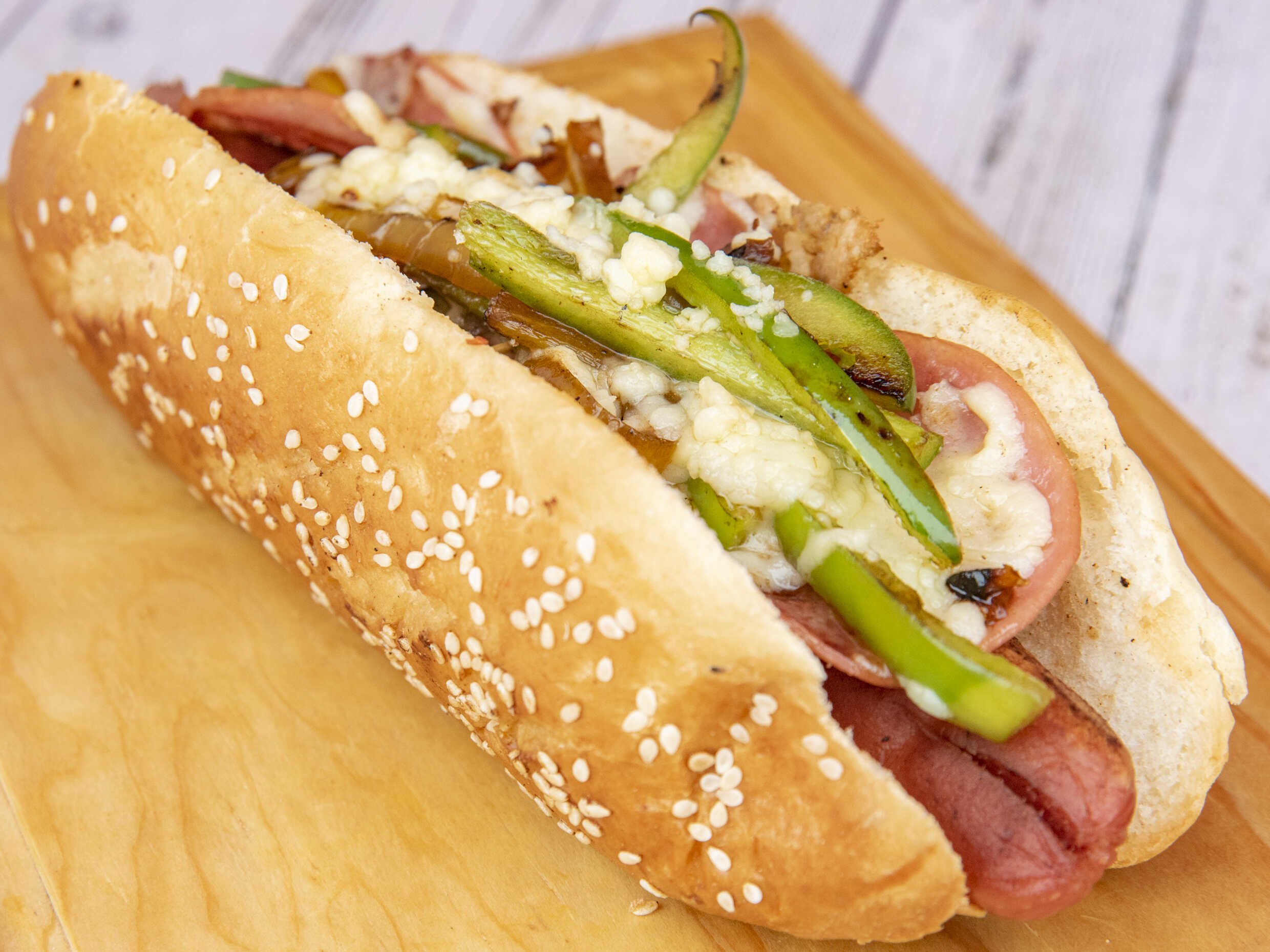 Con salchicha de pavo envuelta en tocino, salami, morrón y queso blanco.