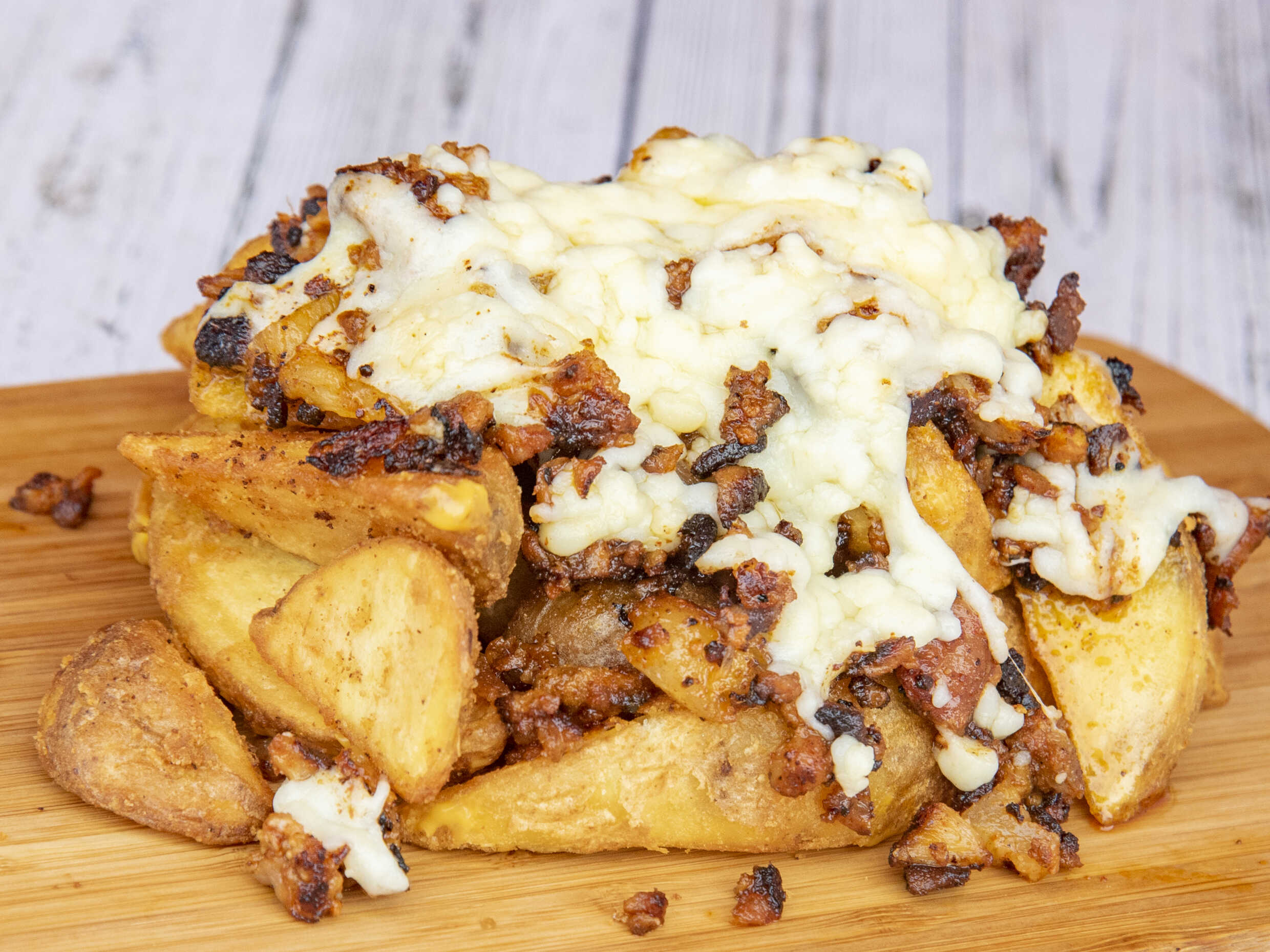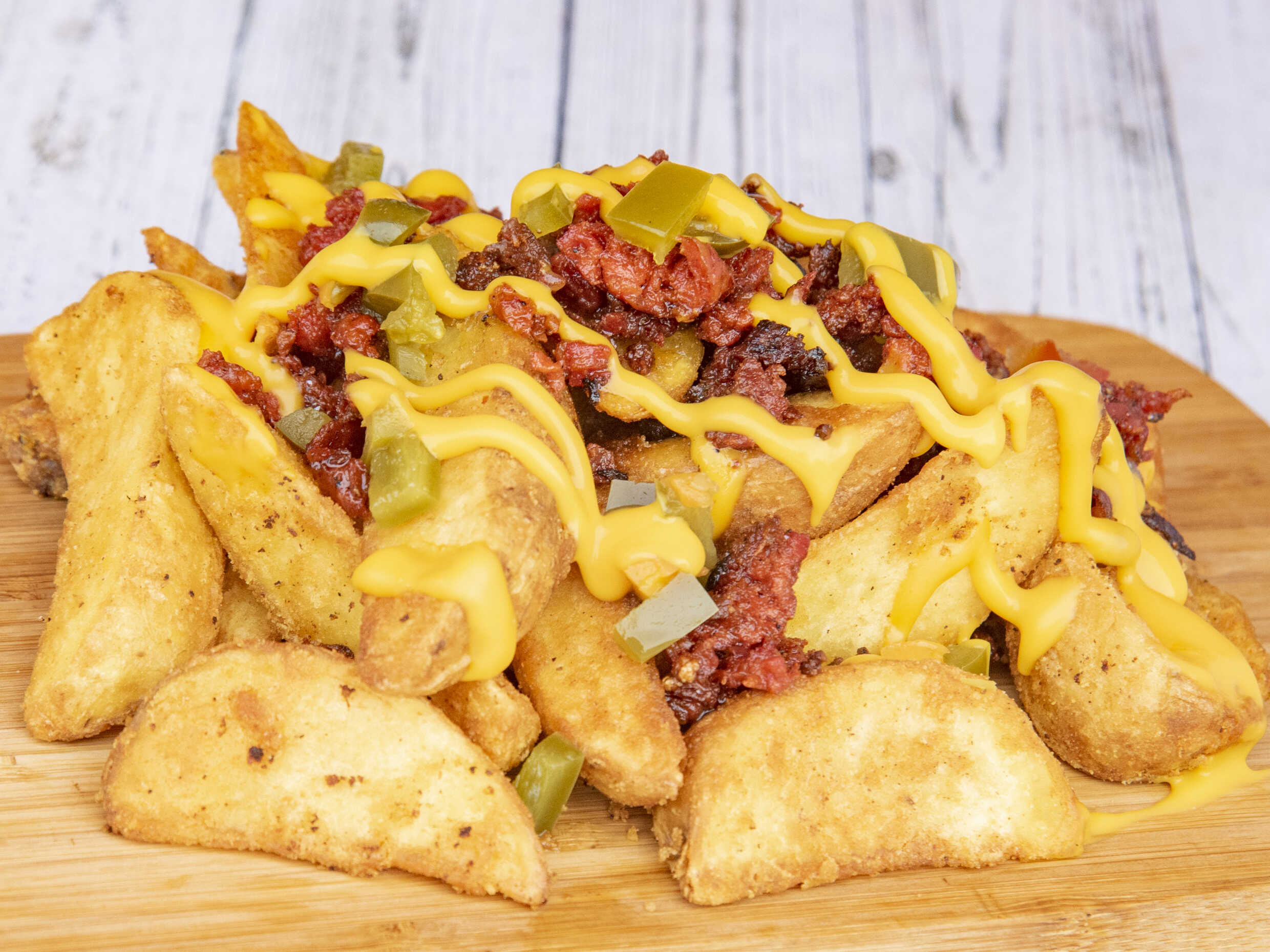 Con carne, cebolla guisada, queso amarillo y crujientes trozos de papa dorada.