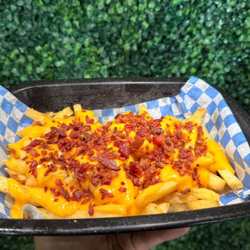 papas a la francesa bañadas en queso con tocino crujientes encima