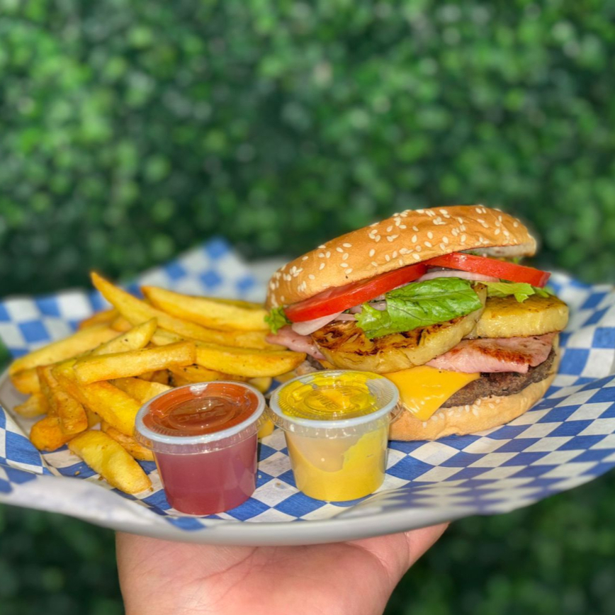 HAMBURGUESA HAWAIANA CON PAPAS A LA FRANCESA