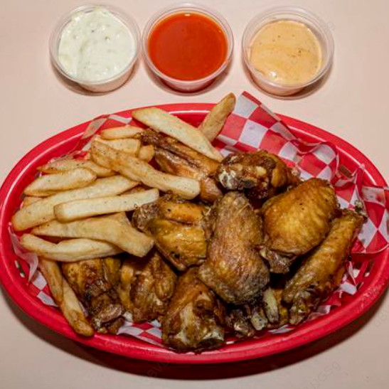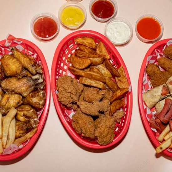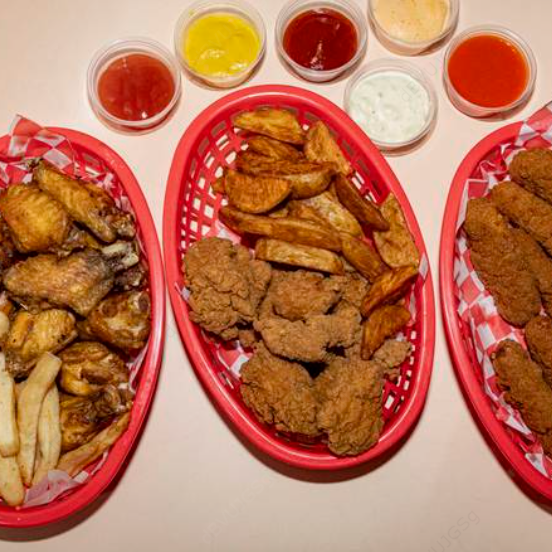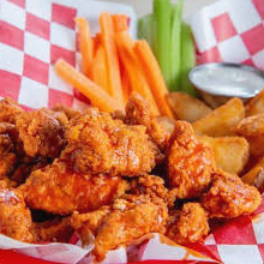 1 kg Alitas (24 pzas), boneless pa compartir (1/2 kg), orden papas gajo, ord dedos queso, refresco 1.75 L.