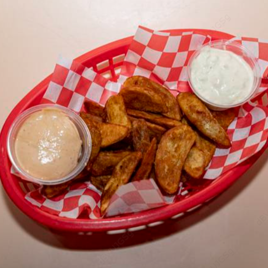Son deliciosas papas gajo con salsa de alas a elección.