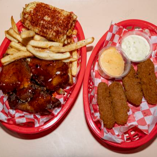 Orden costillas (costilla, papas a la francesa, elote), 1/2 dedos de queso, 1 refresco individual.