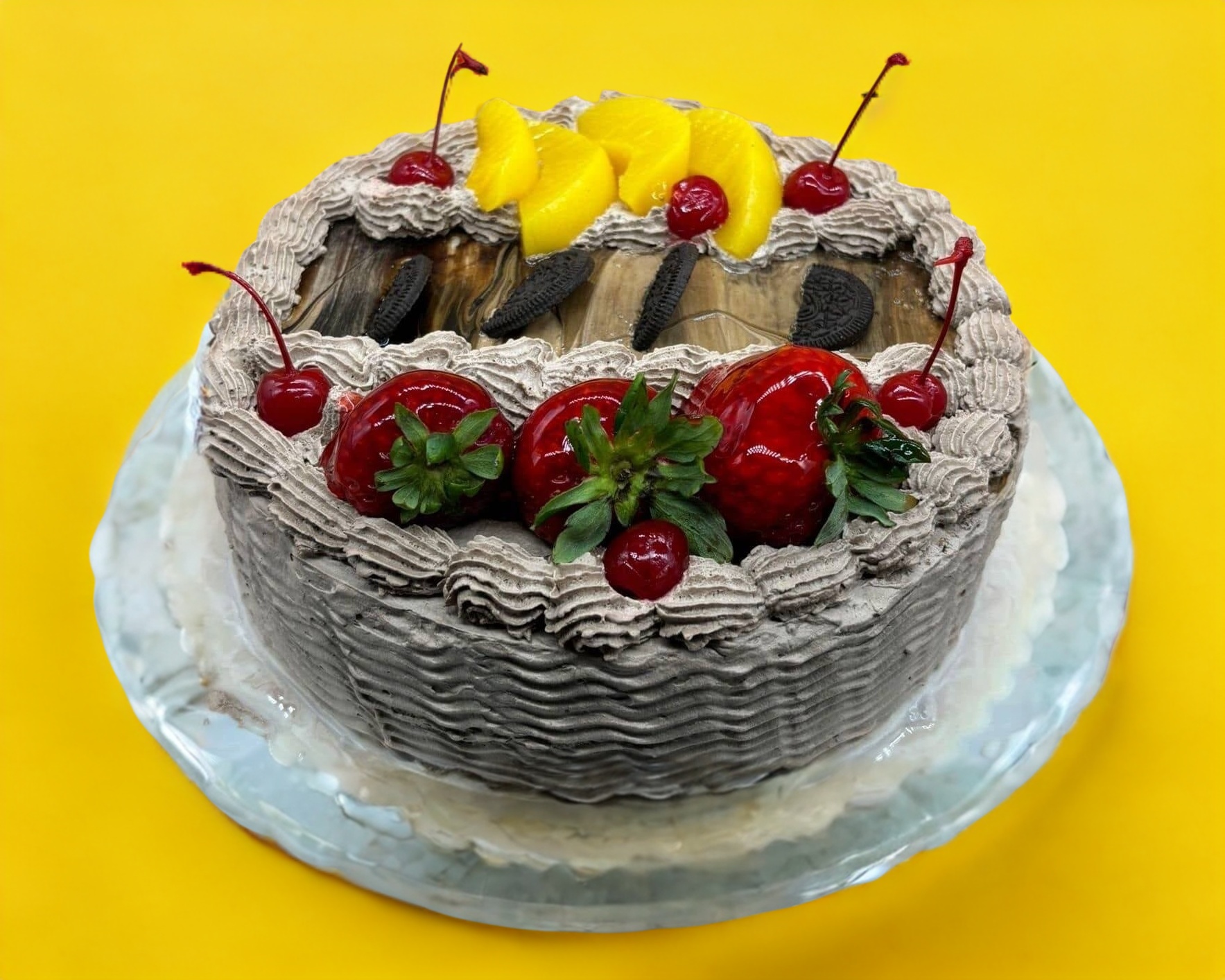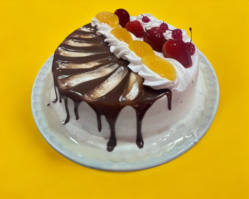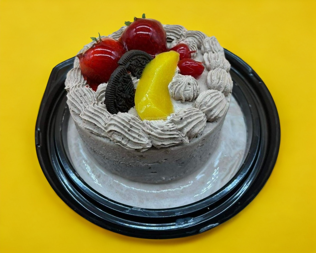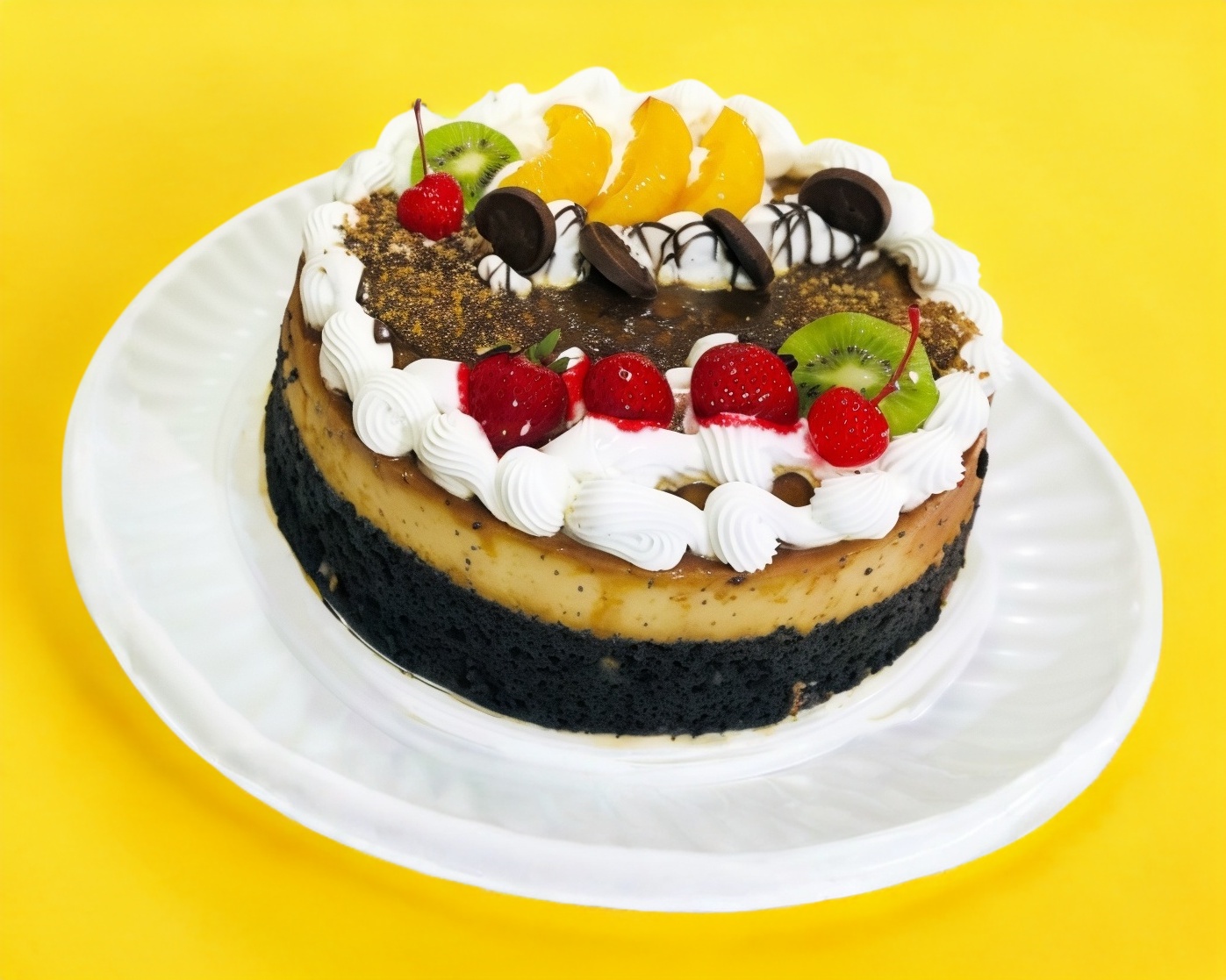 pastel ideal para dos personas sabor 3 leches de chocolate decorado con fruta del dia