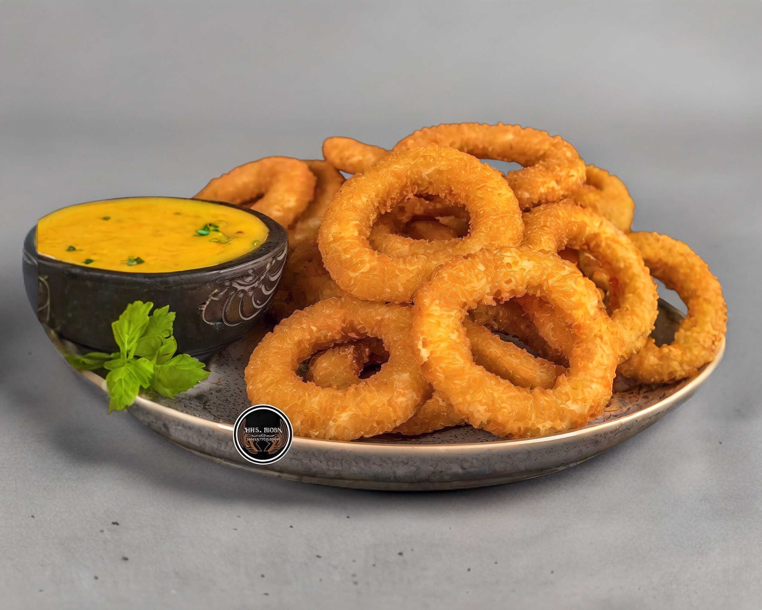 Aros de cebolla freídos en aceite con pimienta y limón.