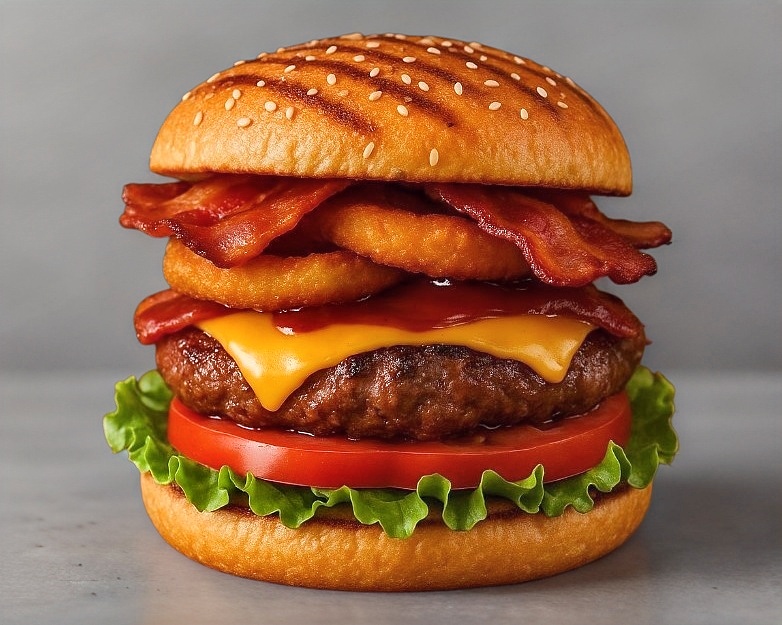 Hamburguesa de res + tocino, aros de cebolla y salsa BBQ