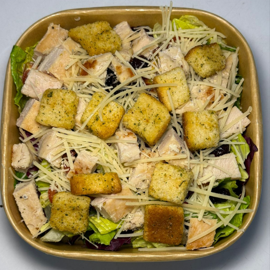 Mezcla de lechugas, arándanos deshidratados, tomate cherry, queso parmesano rallado, crutones,pollo a la plancha y aderezo a elegir peso aproximado 500gr