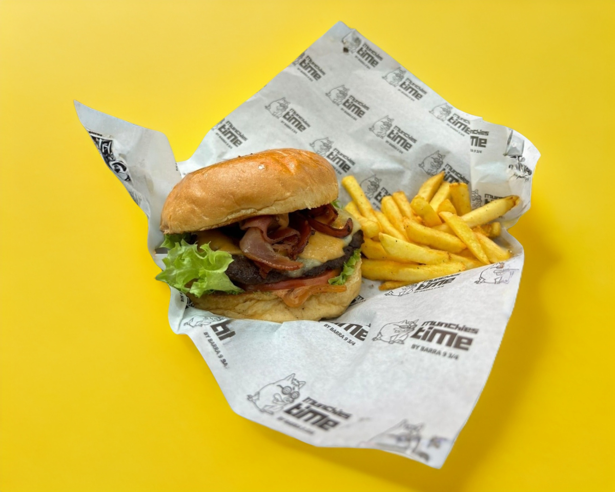 130 g de carne 100% res, queso manchego, aderezo de la casa, vegetales, pan brioche, acompañada de papas a la francesa.