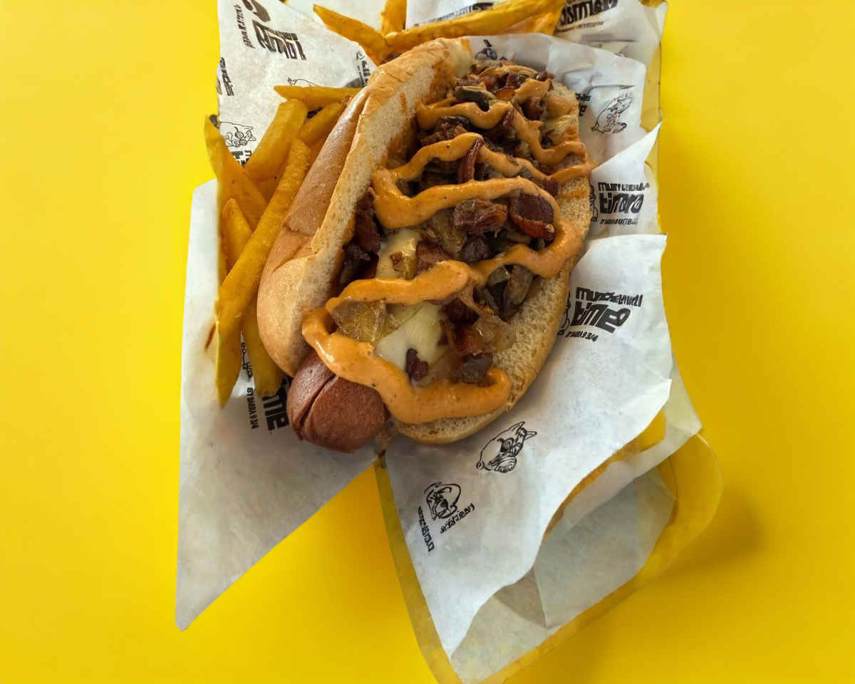 Pan artesanal, salchicha 23 cm con tocino, panela, vegetales, aderezo especial, champiñones, jalapeño y acompañado de papas.