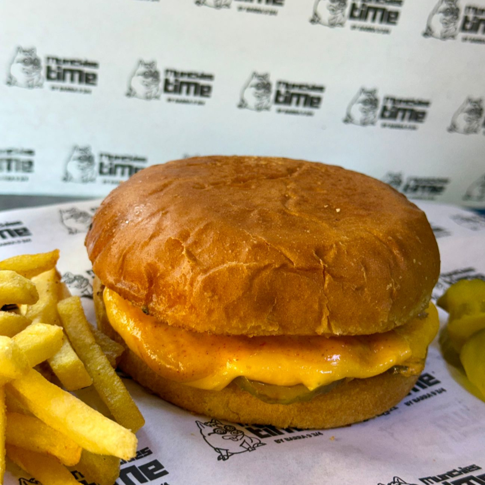 130gr carne de res 100%, pan brioche, doble rebanada de queso americano, cebolla pepinillos catsup y mostaza, acompañada de papas a la francesa un clásico americano