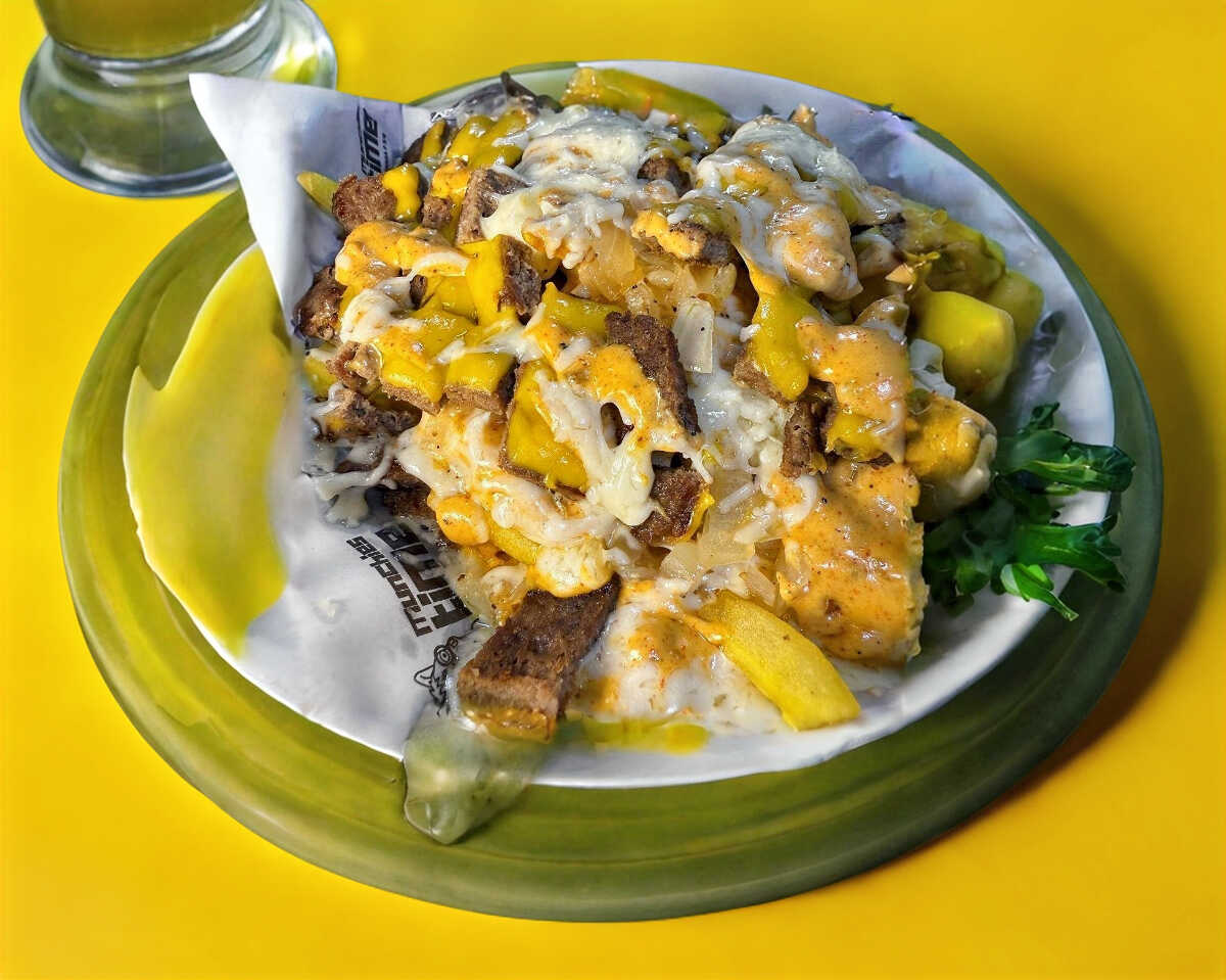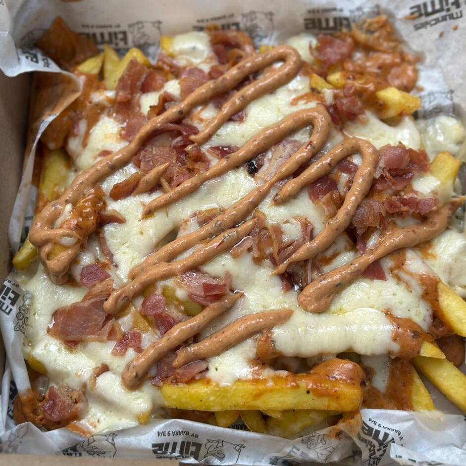 300gr de papas francesa con 130gr de carne 100% res con queso americano bañadas en nuestro aderezo especial de hamburguesa y gratinadas con queso manchego y cebollita caramelizada