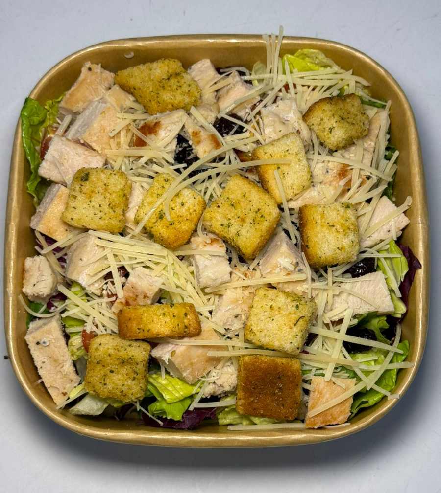 Ensalada de la casa Mezcla de lechugas, arándanos deshidratados, tomate cherry, queso parmesano rallado, cruotones,pollo a la plancha y aderezo a elegir peso aproximado 500gr