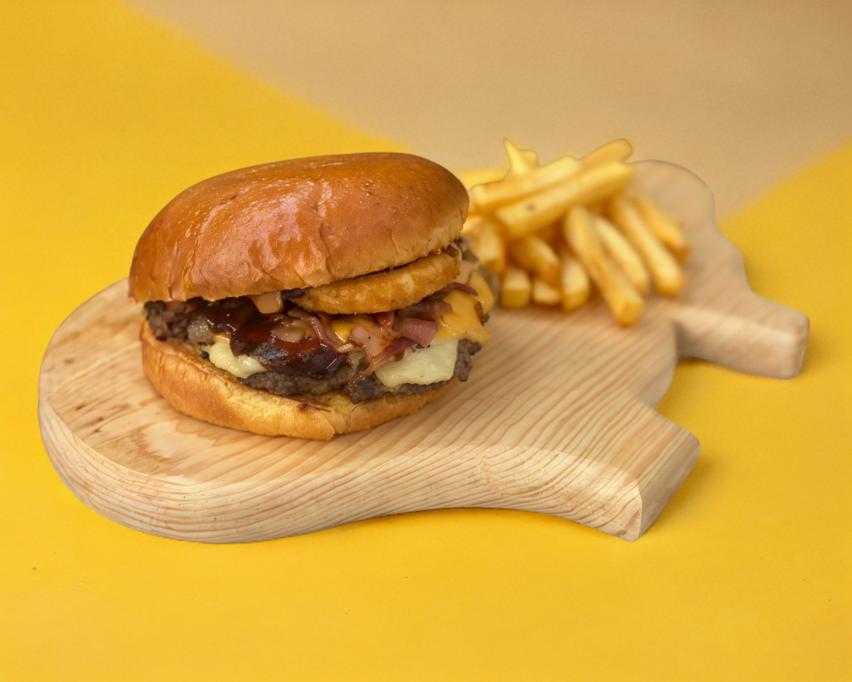 130 g de carne 100% res, queso americano, (aros de cebolla), salsa bbq, cebolla caramelizada, pan brioche, acompañada de papas.