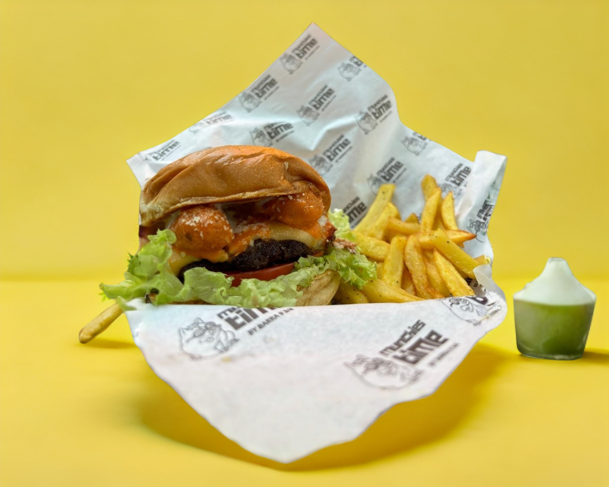 130 g de carne 100% res, pollo búfalo, tocino, queso manchego,aderezo especial, vegetales, pan brioche, acompañada de papas.