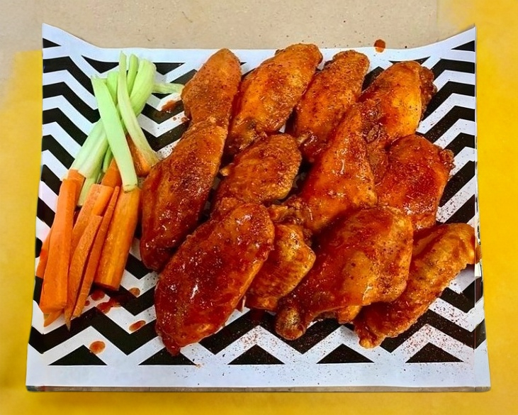 10 Piezas de alitas crujientes bañadas en tu salsa favorita acompañada de un aderezo.