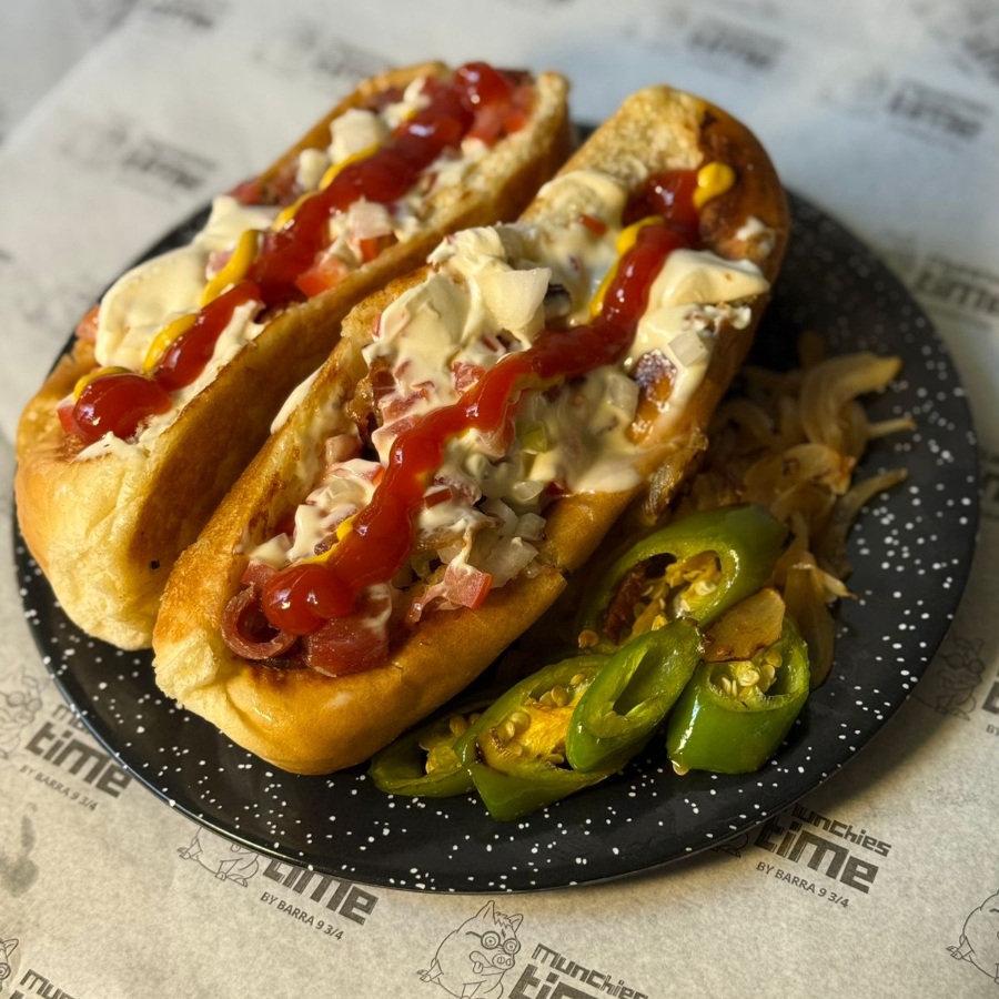 dogo estilo sonora con pan hecho en casa, tocino picadito, cebolla, jitomate, crema, catsup y mostaza acompañado con cebollita guisada y chile toreado