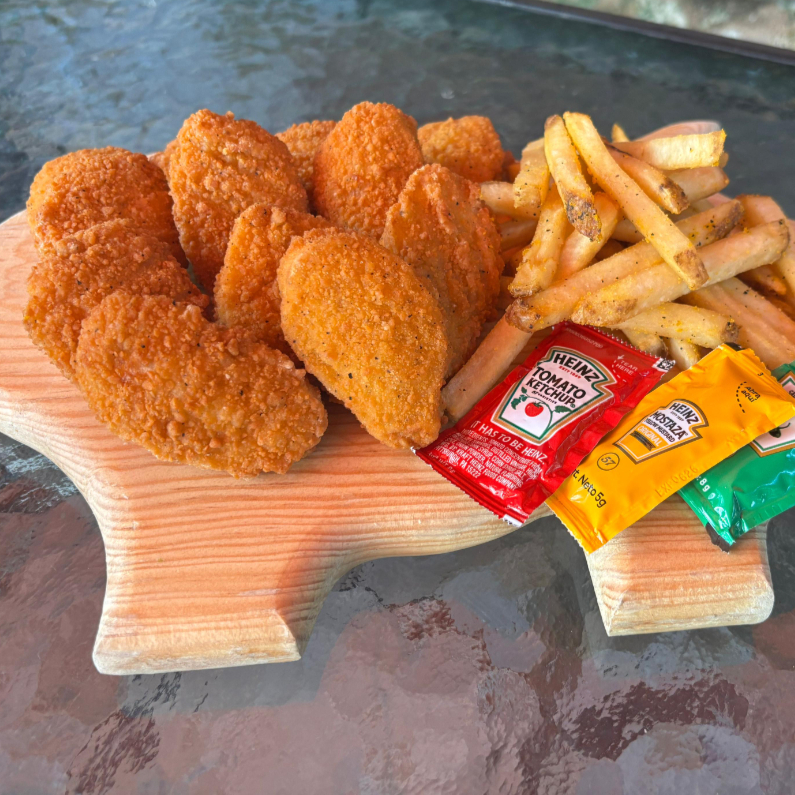 Base de papas francesa o gajo, tiras de pollo crujiente bañadas en tu salsa favorita y queso manchego gratinado.