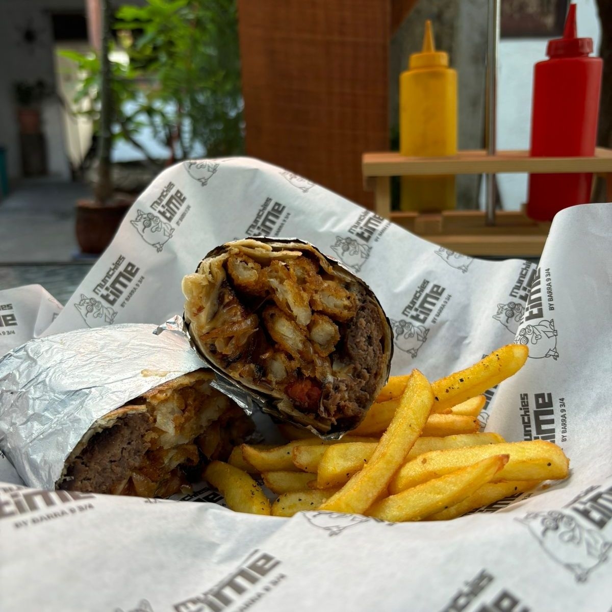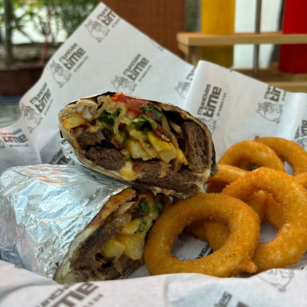 130 g de carne 100% res con queso americano, tocino crujiente papas a la francesa y costra de queso manchego,montado sobre tortilla de harina con el toque de nuestro aderezo de la casa y cebolla caramelizada, incluye 100g de aros de cebolla como guarnición