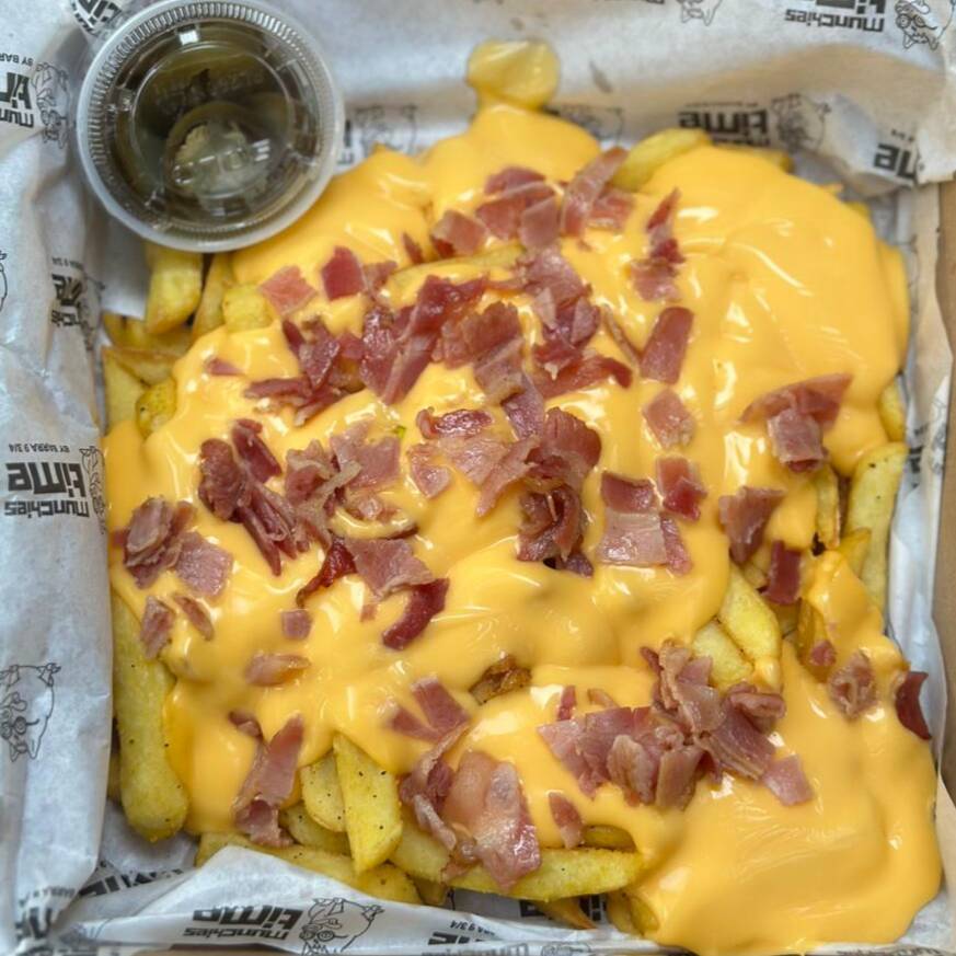 300g de tus papas favoritas bañadas en queso de nacho con trocitos de tocino crujiente y chiles jalapeños.