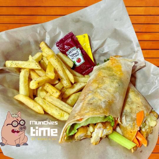 Tortilla de harina grande con tiras de pollo crispy, lechuga jitomate apio y zanahoria, queso manchego gratinado y aderezo chipotle