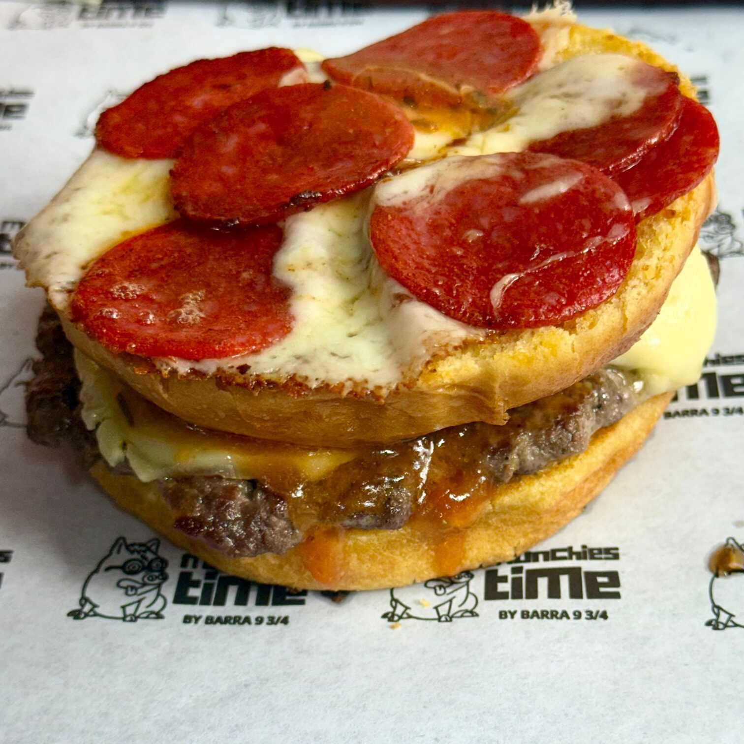 130gr de carne 100% res con queso manchego salsa marinara pepperoni y mas queso manchego sobre un pan brioche, acompañado de papas