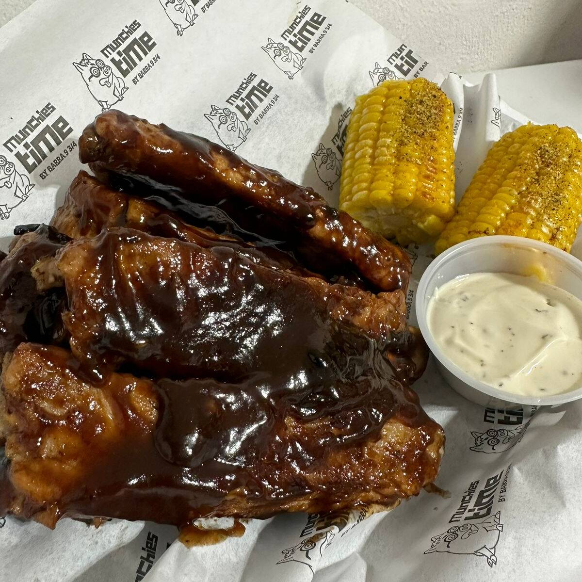 350 gramos de deliciosas costillas jugosas, bañadas en salsa bbq especial y acompañadas de elote dulce o papas.