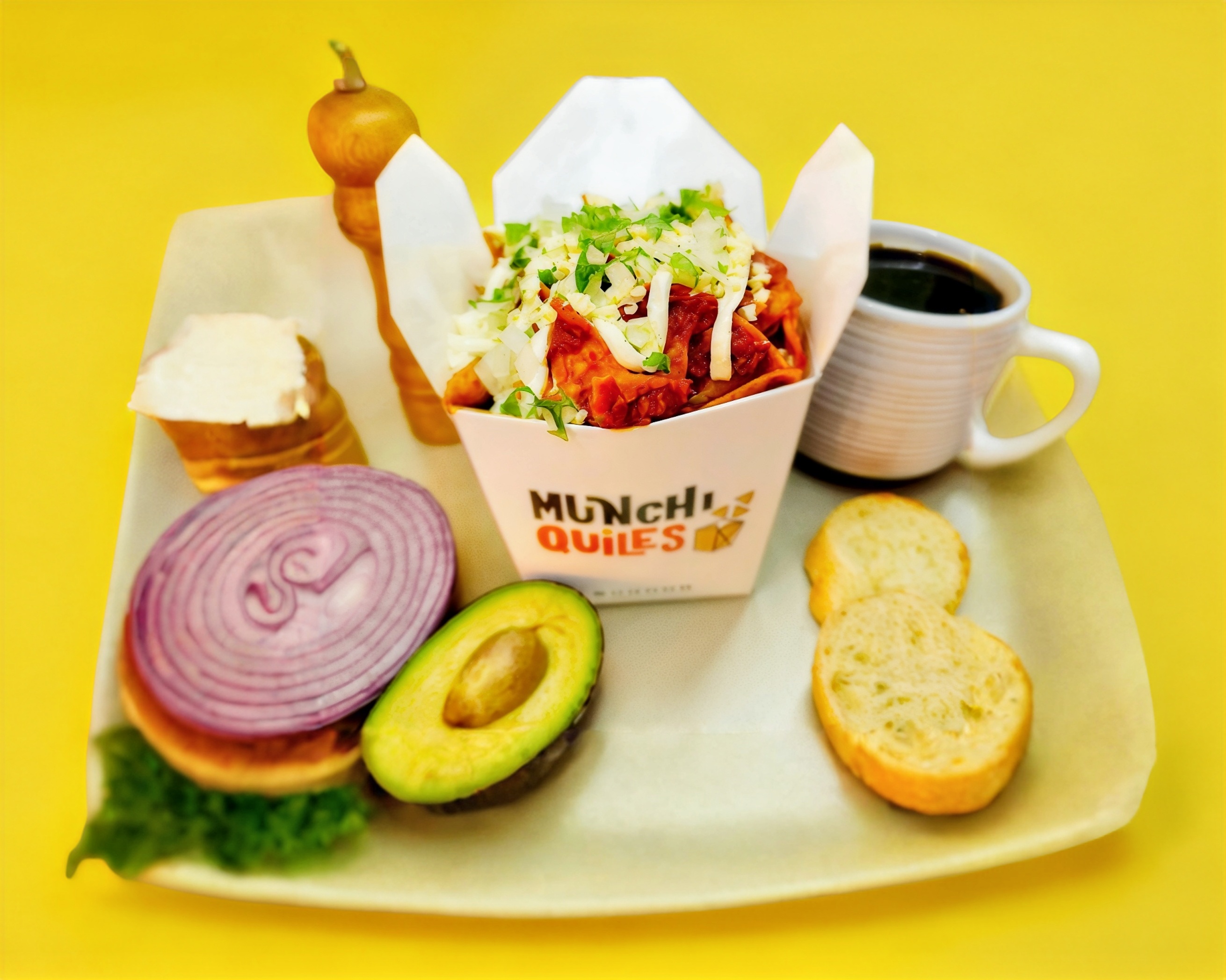 Una porción generosa de 450g de puro placer mañanero, nuestros chilaquiles vienen en una práctica cajita estilo asiático, pero con el auténtico corazón mexicano. Disfruta de totopos crujientes bañados en nuestra salsa especial, coronados con crema fresca, queso, cilantro y cebolla. Plato personal