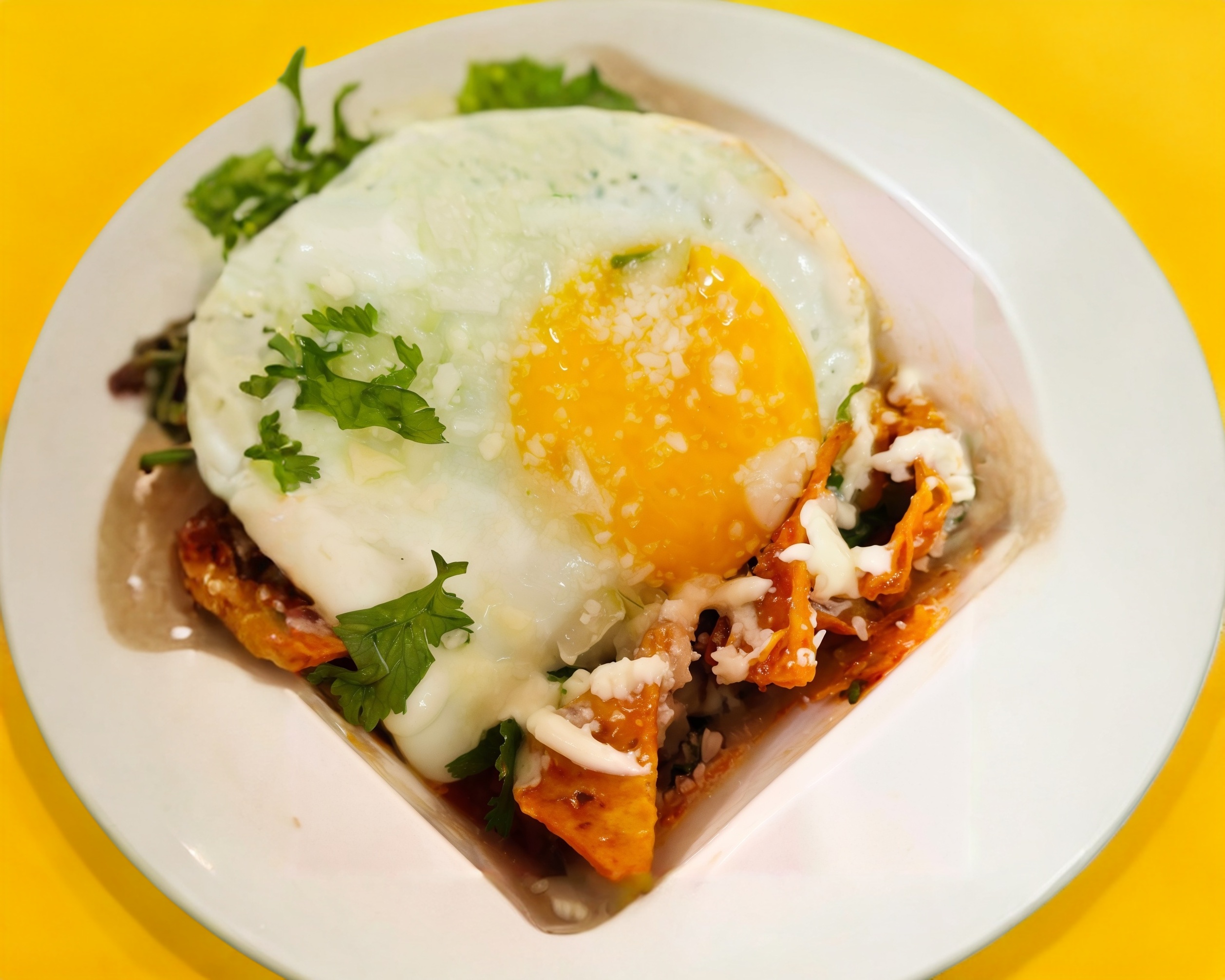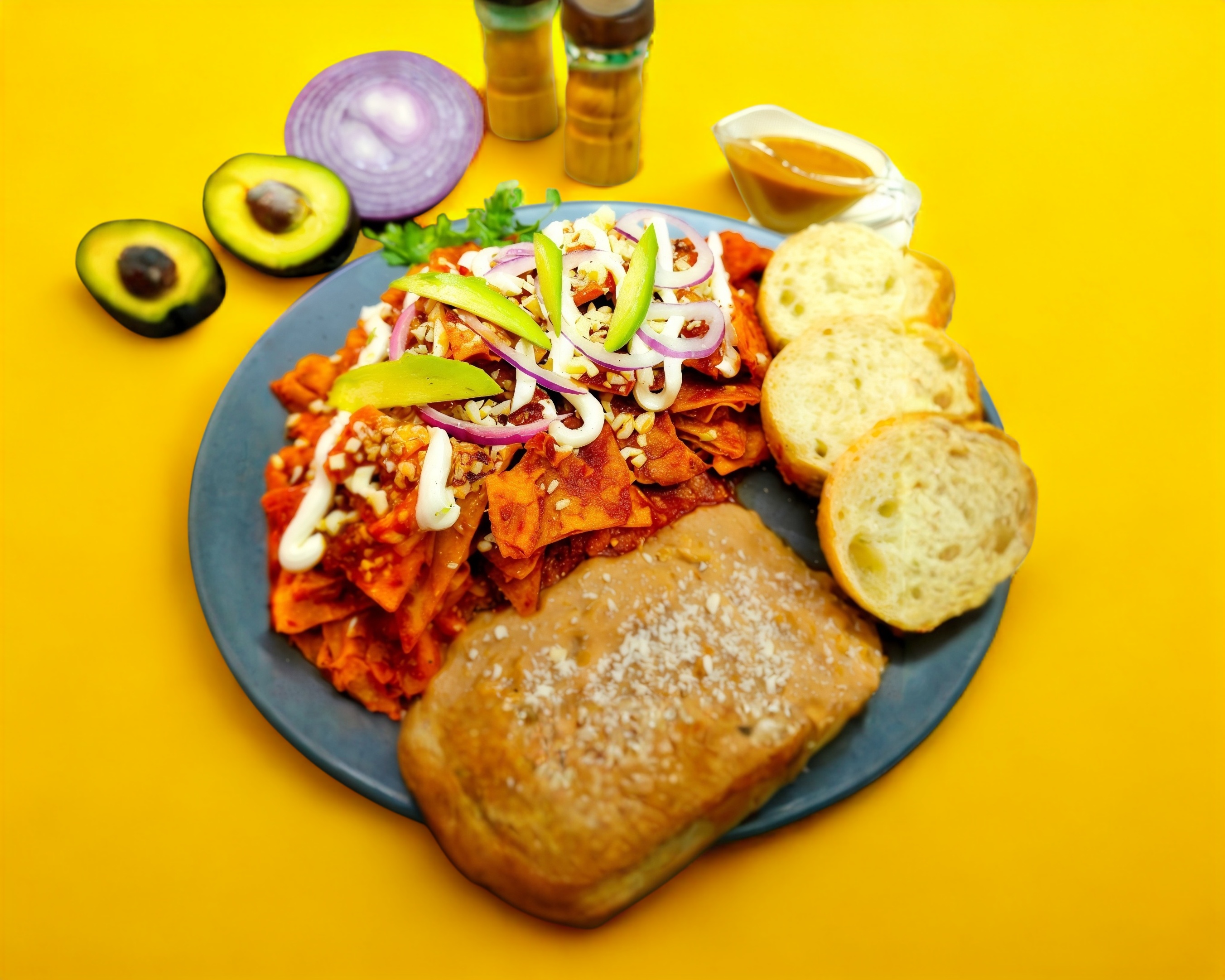 1/2 orden de chilaquiles bañados en la salsa de tu elección, para completar esta delicia te servimos una porción de cremosos frijoles refritos, queso, crema fresca y bolillo en rodajas.