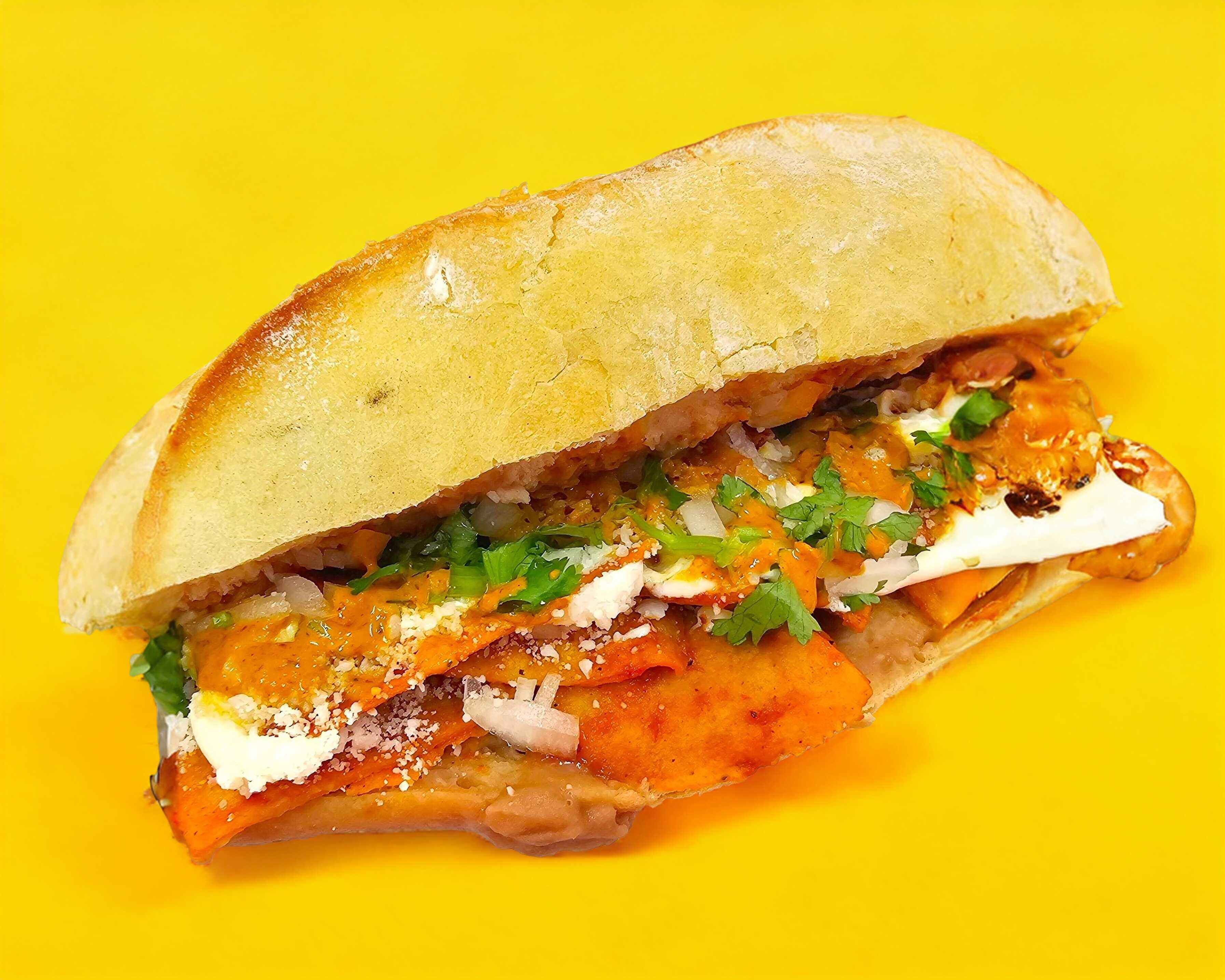 Crujiente lonche de ricos chilaquiles, con la salsa de tu preferencia.