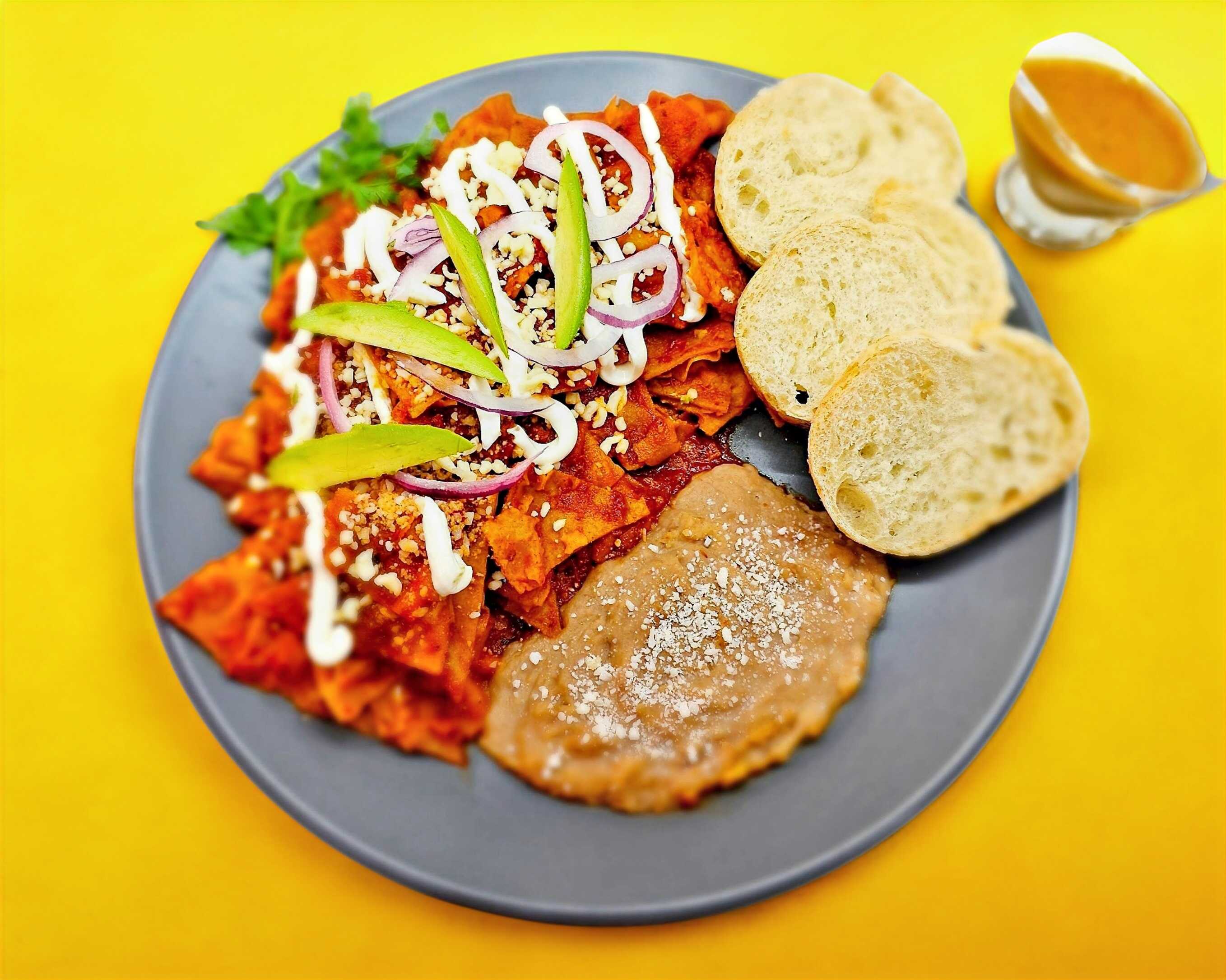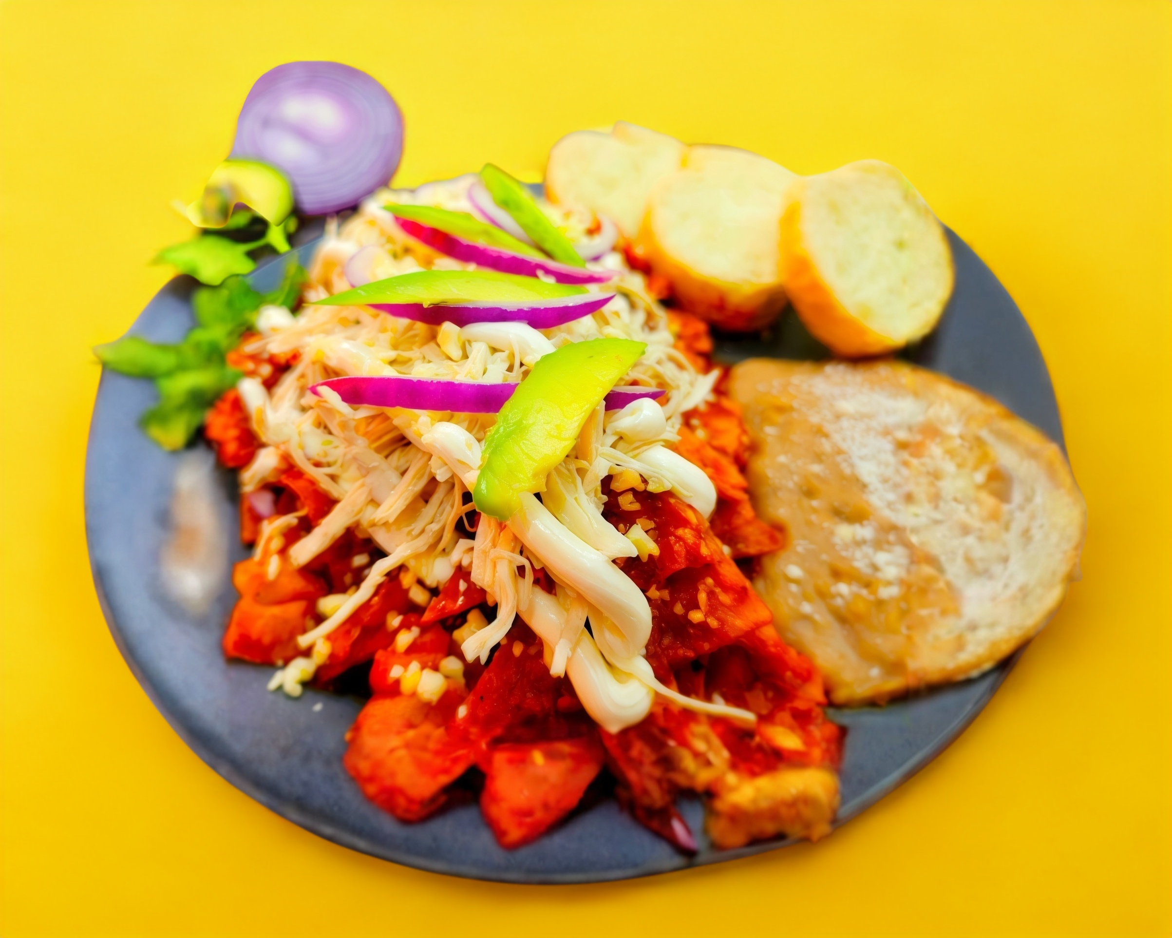 Crujientes chilaquiles bañados en la salsa de tu elección, para completar esta delicia te servimos una porción de cremosos frijoles refritos, queso, crema fresca y bolillo en rodajas.