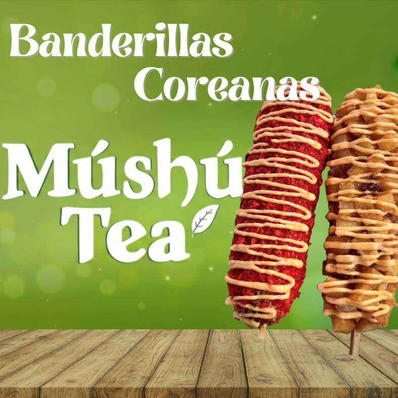 Deliciosa banderilla coreana de Queso gouda y salchicha, envuelta en papa y panko. Elije tu aderezo favorito