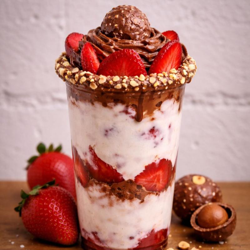 Deliciosas fresas frescas con crema de la casa y crema de ferrero (este producto contiene almendras)