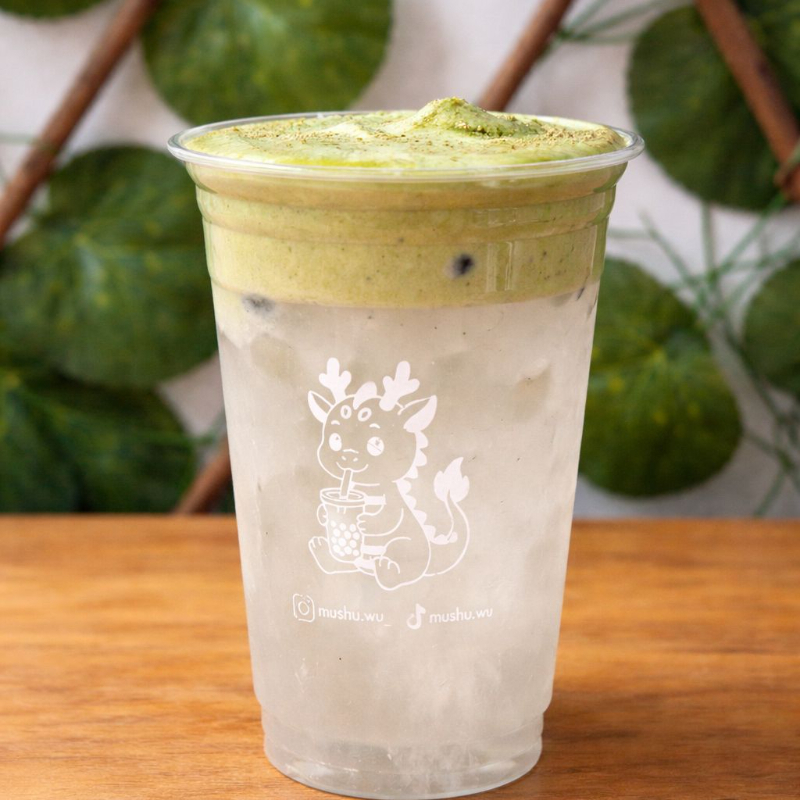 A base de leche con nuestro delicioso matcha, cremoso y refrescante con dulce mango en el fondo + una porcion de tapioca
