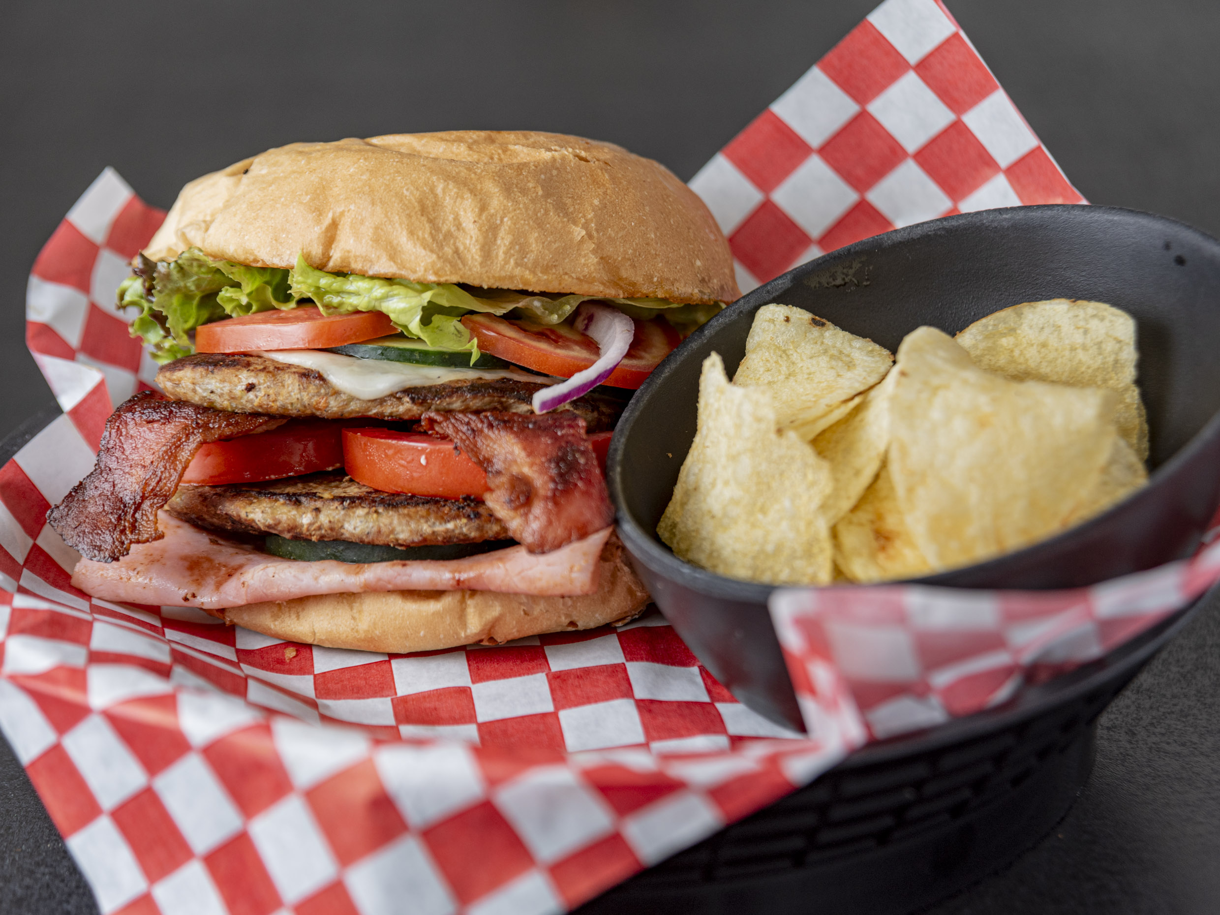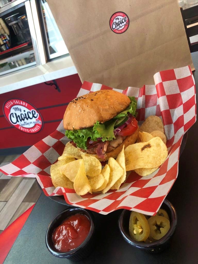 150 Gramos de carne, pan fresco, deliciosos vegetales y chips