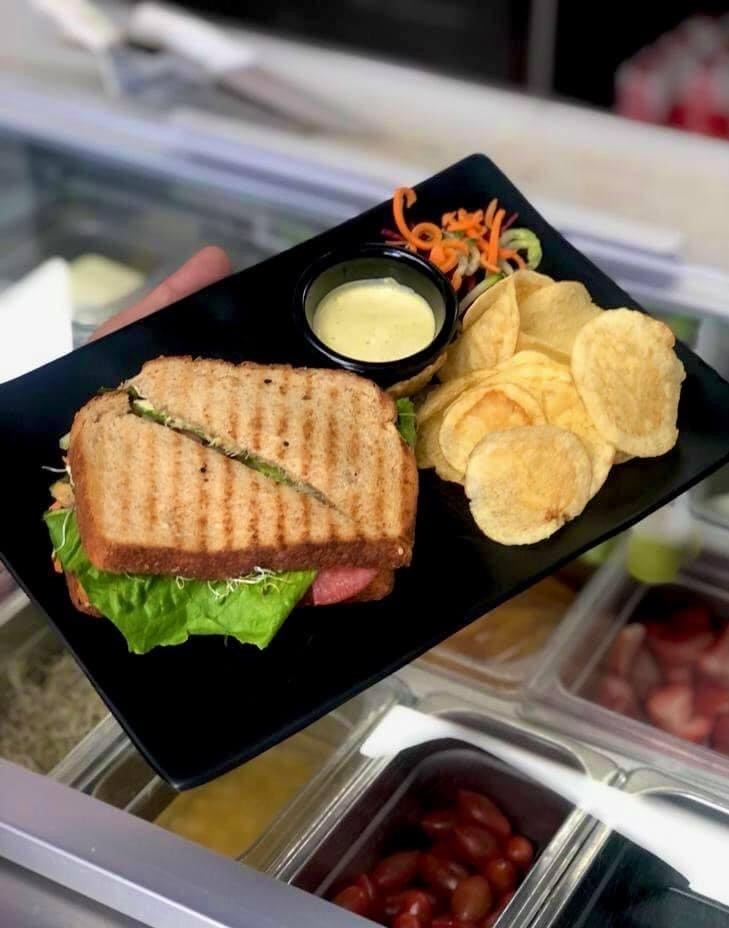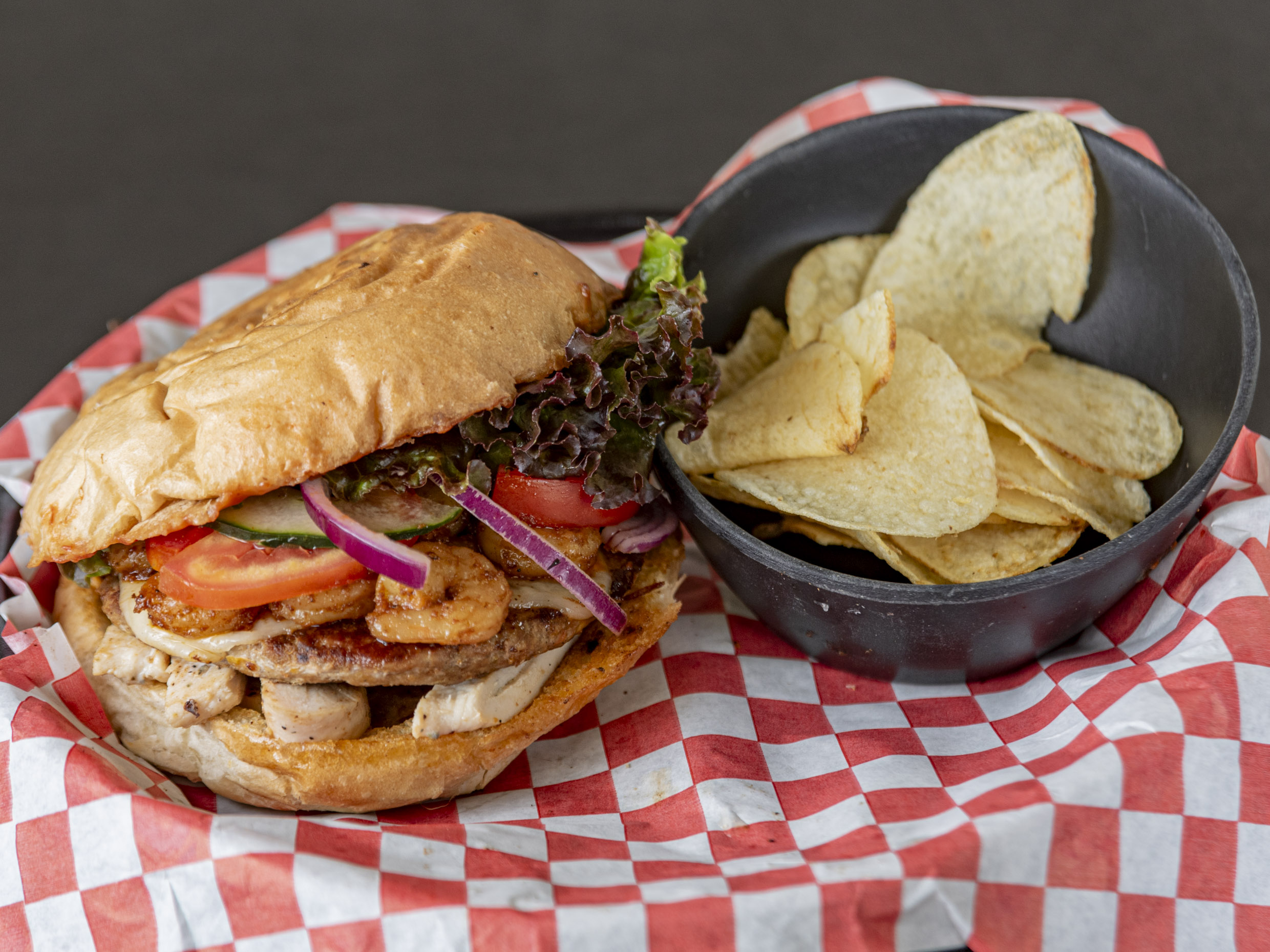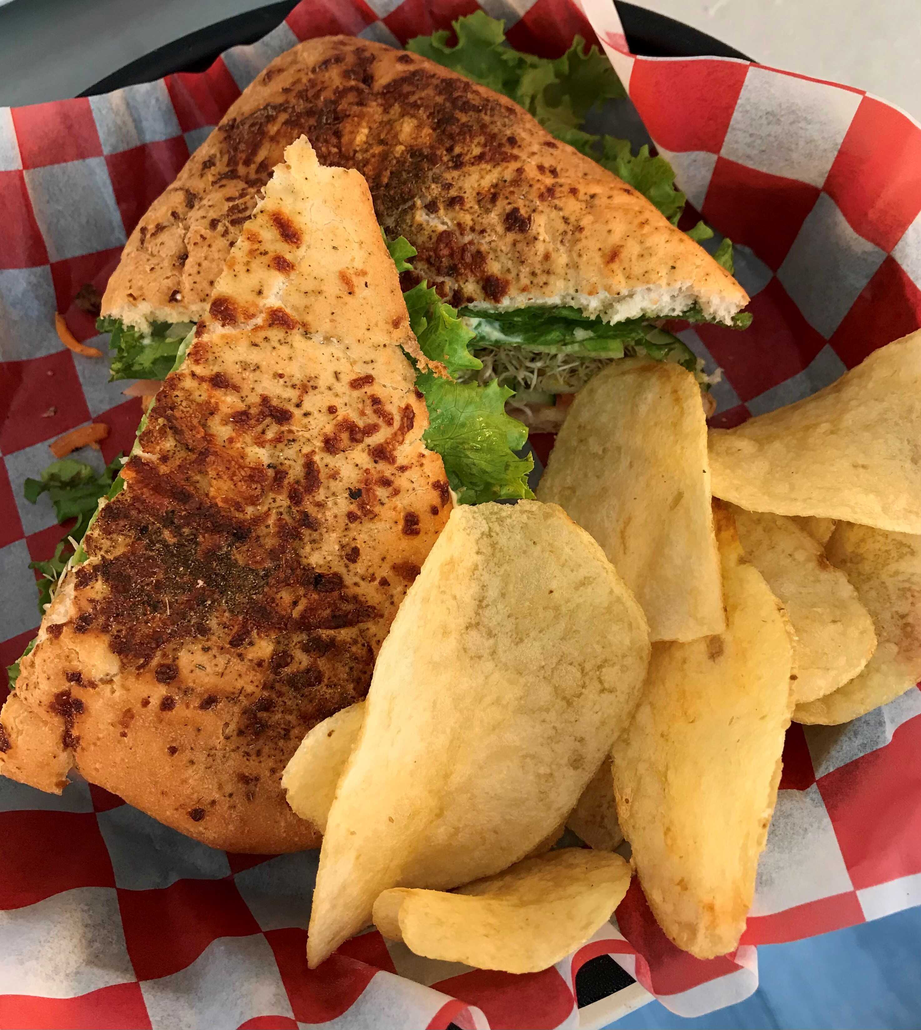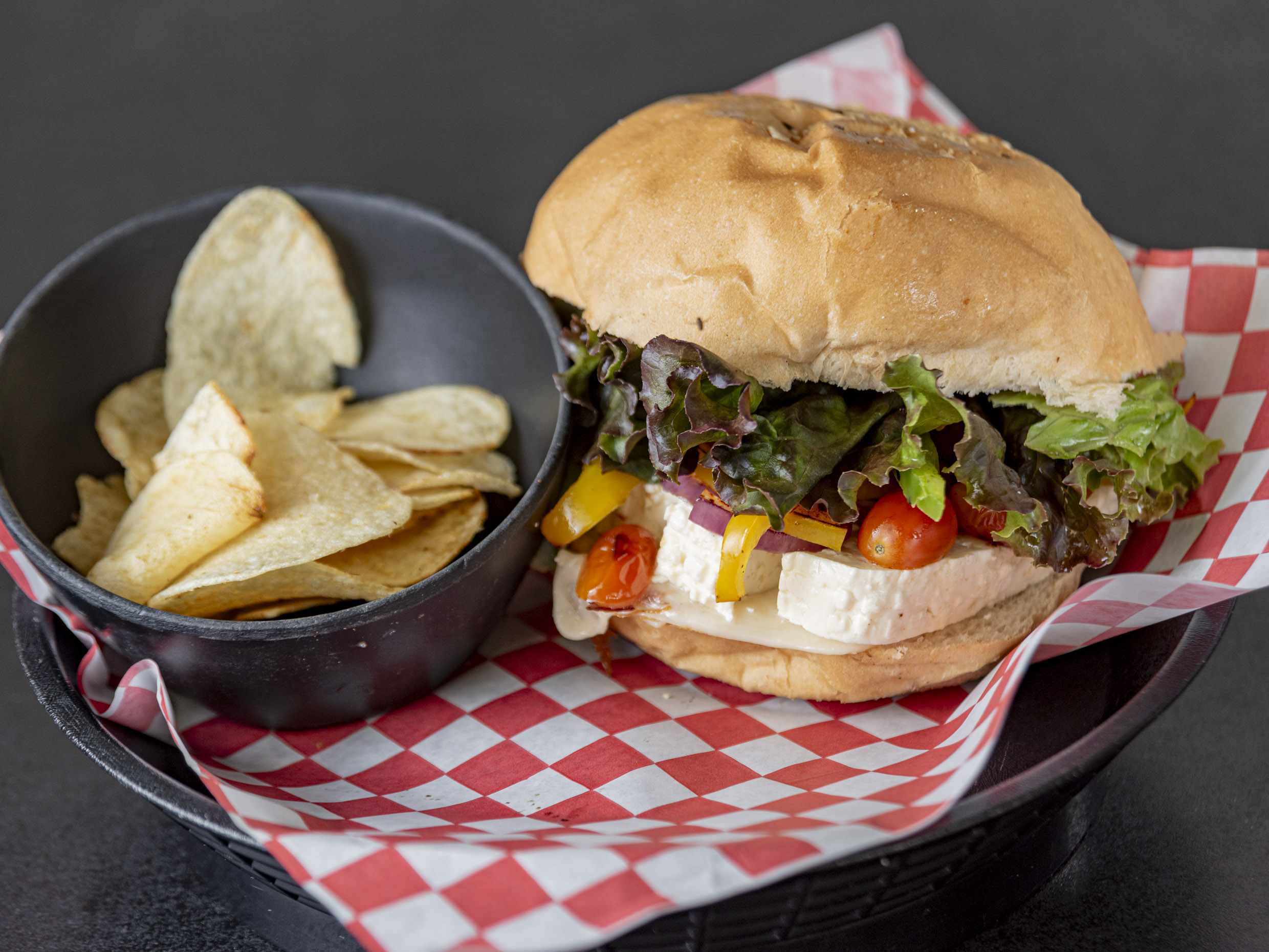Pollo, jamón de pavo, panela fresca, queso manchego, jitomate, lechuga pepino, zanahoria y germinado. Acompañado de chips.