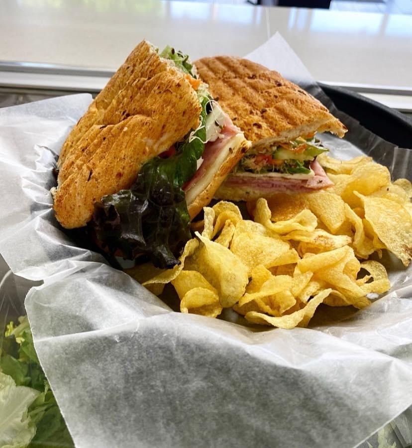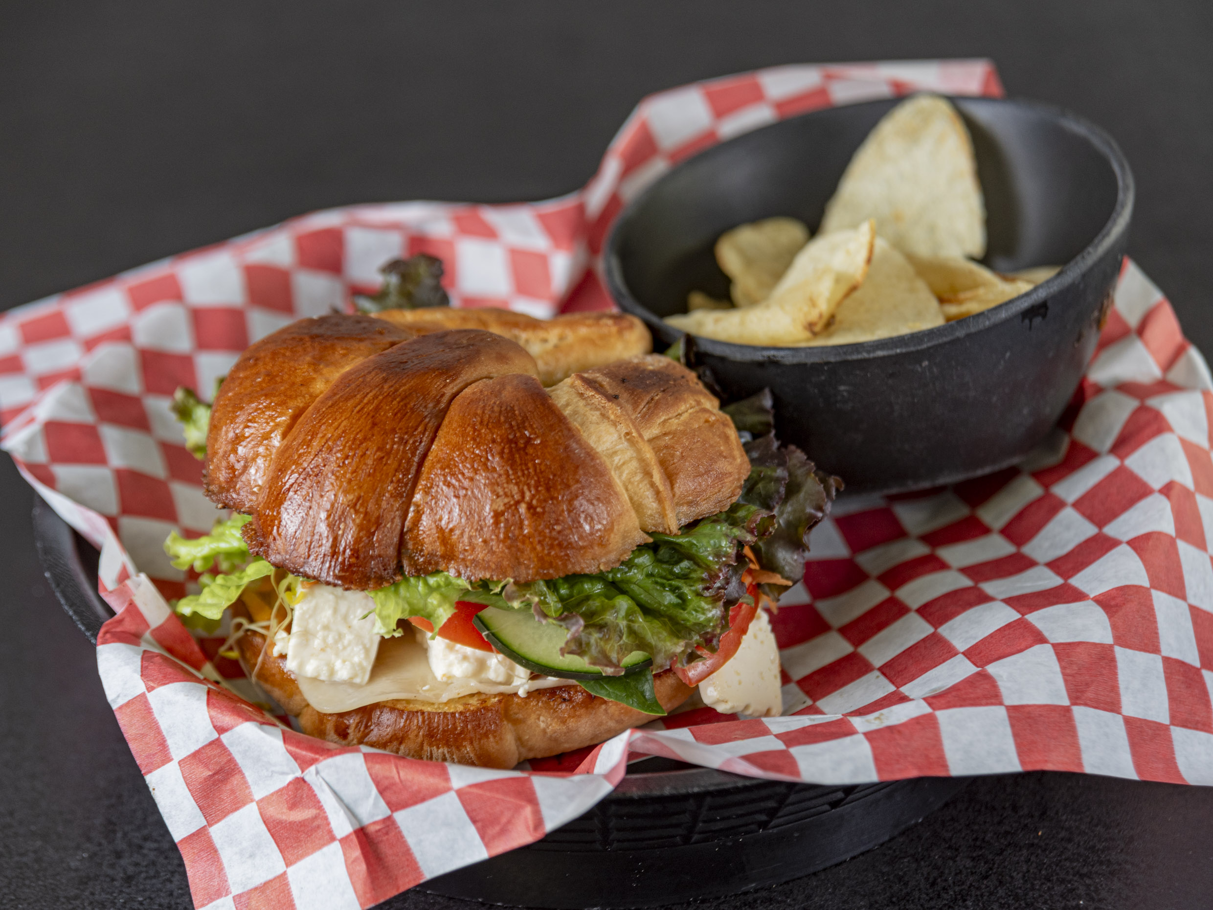 Delicioso Croissant de panela con queso manchego, lechuga, jitomate, zanahoria, pepino, espinaca y germinado