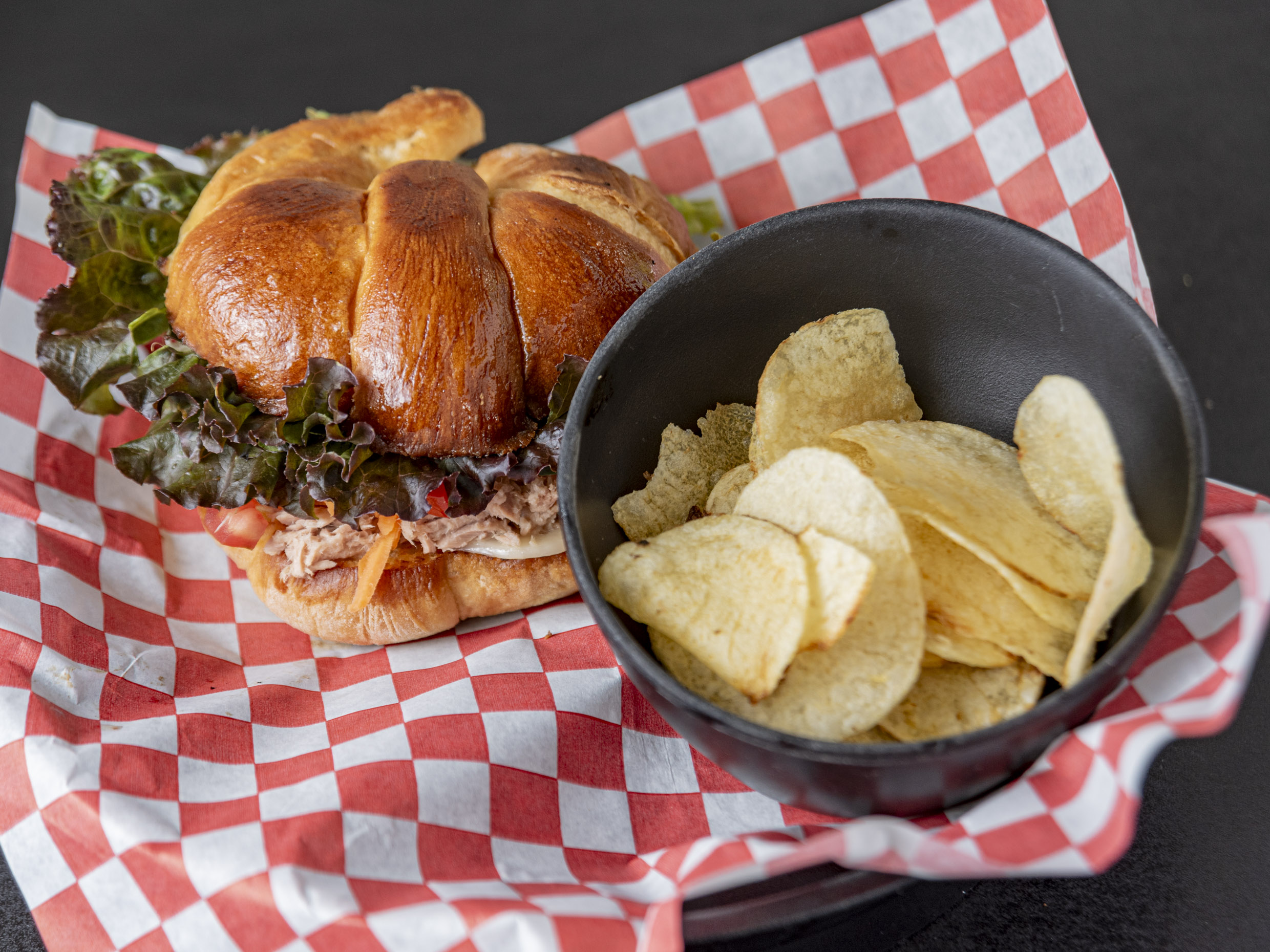 Delicioso Croissant de pollo con queso manchego, lechuga, jitomate, zanahoria, pepino, espinaca y germinado