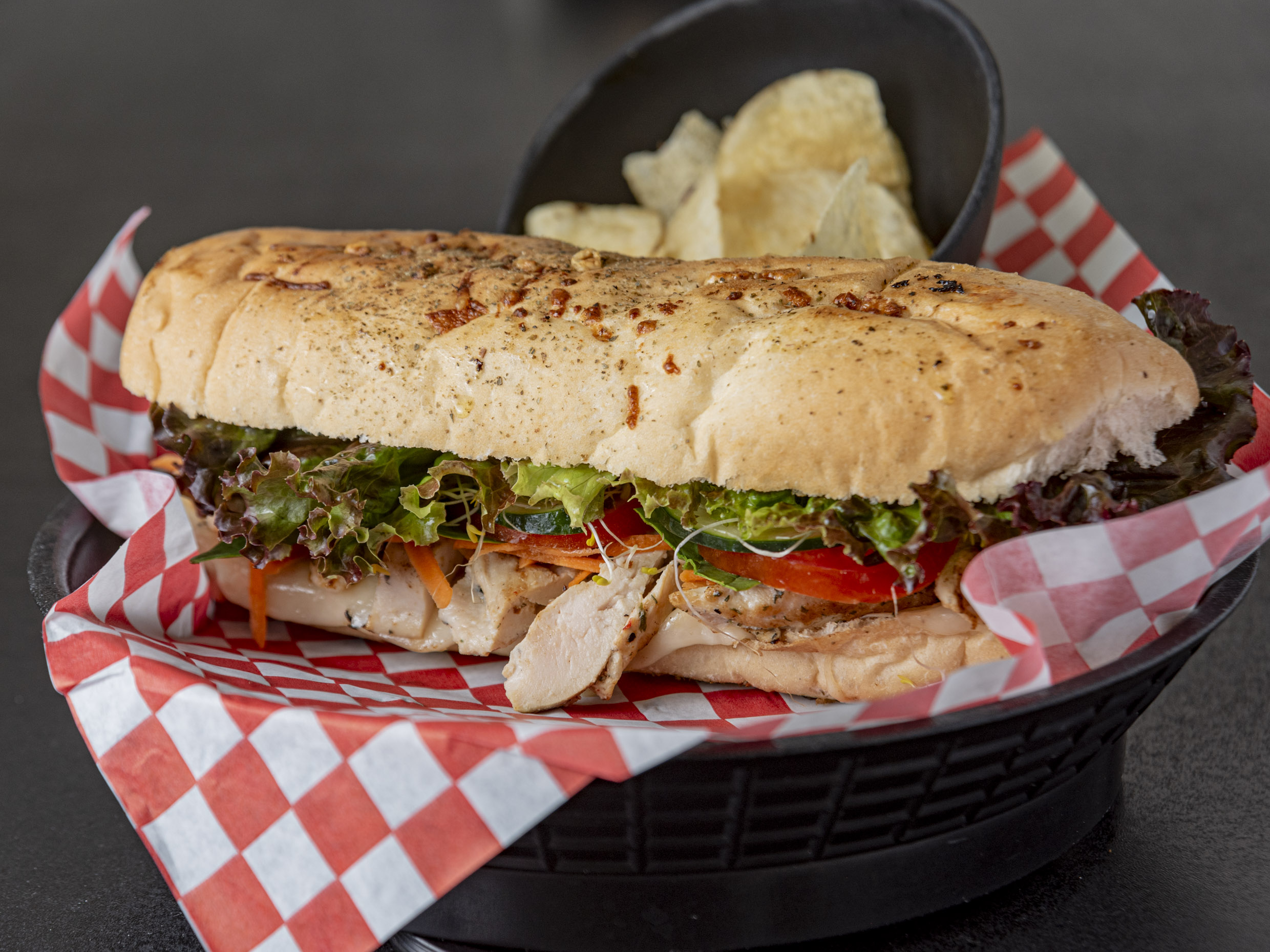 Delicioso Sandwich de pollo queso manchego, lechuga, jitomate, zanahoria, pepino, espinaca y germinado