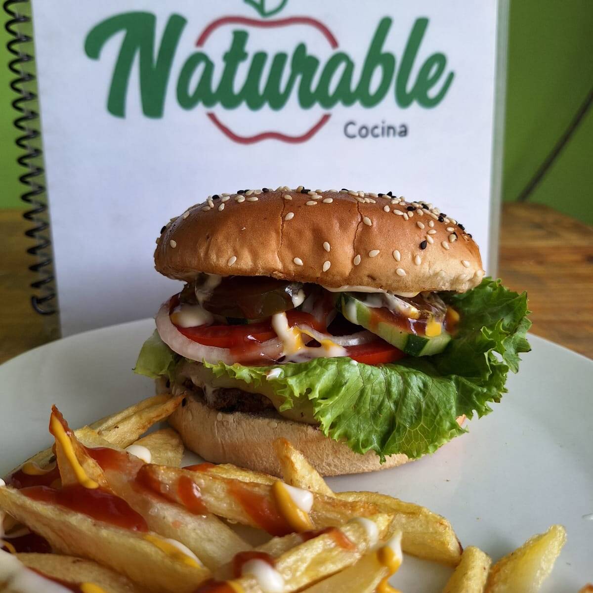 Rica Hamburguesa clasica con carne preparada con ingredientes de la casa acompañado de vegetales frescos (las papas a la francesa se vende por separado)