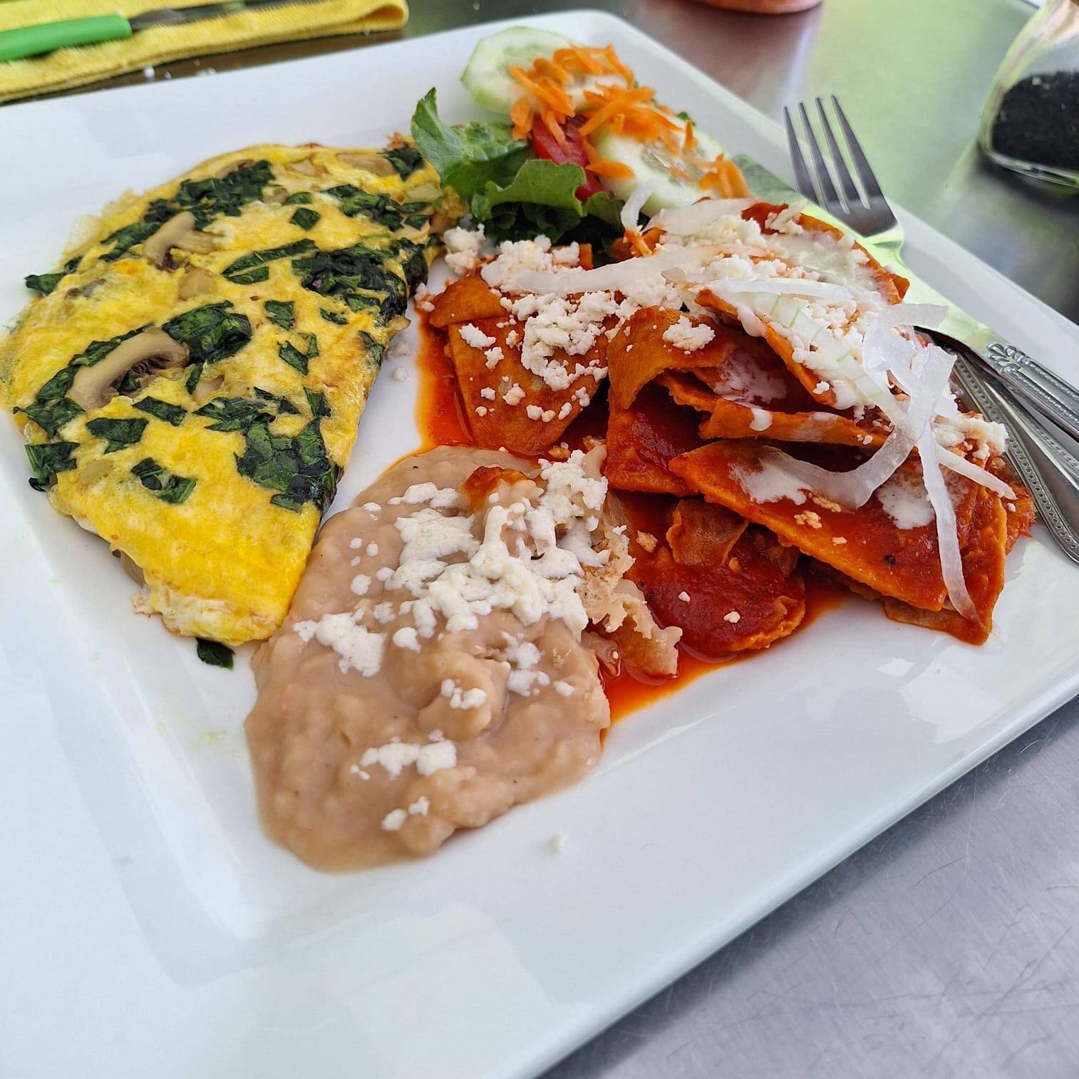 Omellete al gusto acompañados de chilaquiles, frijoles y ensalada.