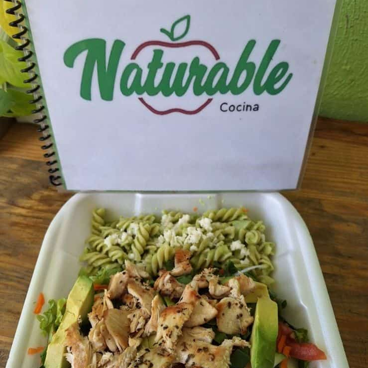 ENSALADA FRESCA acompañada de pasta verde preparada con ingredientes de las casa + aderezo + proteina