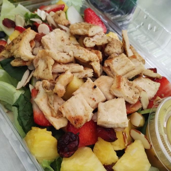 Lechuga, espinaca, fresa mango, piña, uva, manzana y frutos rojos + aderezo + proteina