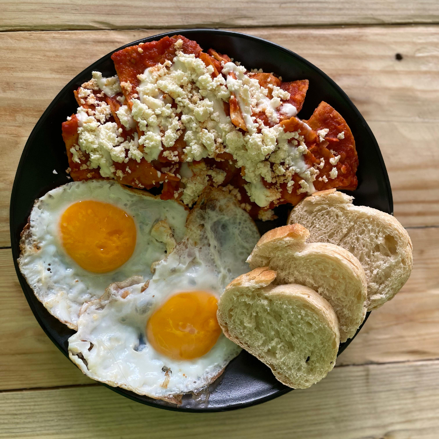 Porcion personal de chilaquiles rojos o verdes acompañados de huevo, frijoles y pan.