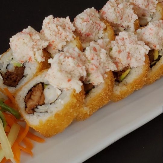 Por dentro: Kani tempura y por fuera: Alga tempura, toping de ensalada de kani y bañada en salsa de anguila.